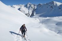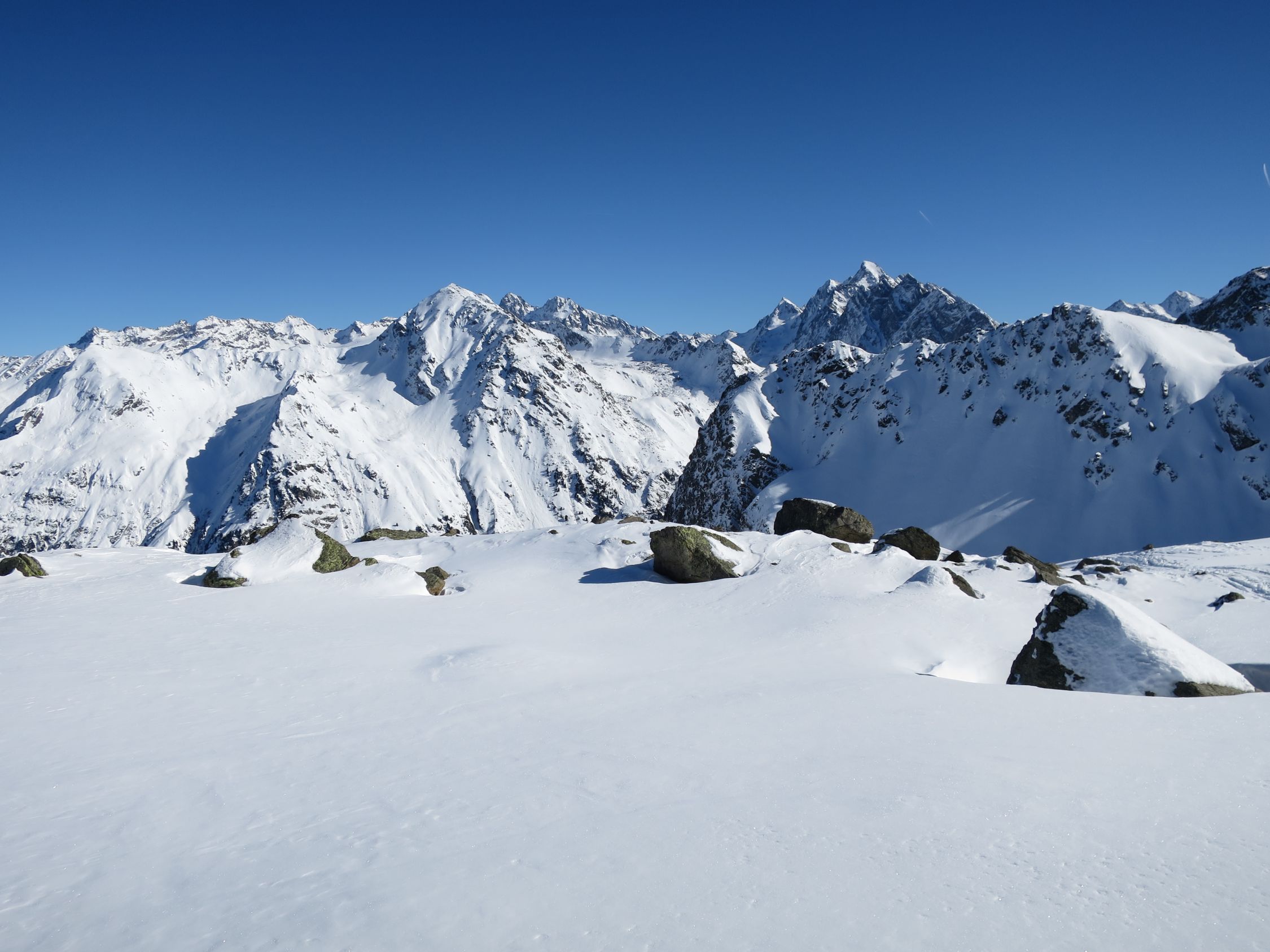 Statt via Gitzihöreli sind wir vom Novaier Tälli etwas südwestlich und höher Richtung Gatschiefer aufgestiegen in die Lücke (ca 2550m) östlich vom Gatschiefer. Ich fand diese Route schöner und weniger warm als die Normalroute (auf der es manchmal doch sehr warm werden kann). Die Abfahrt ist auch etwas länger und die Hänge sind breiter.
