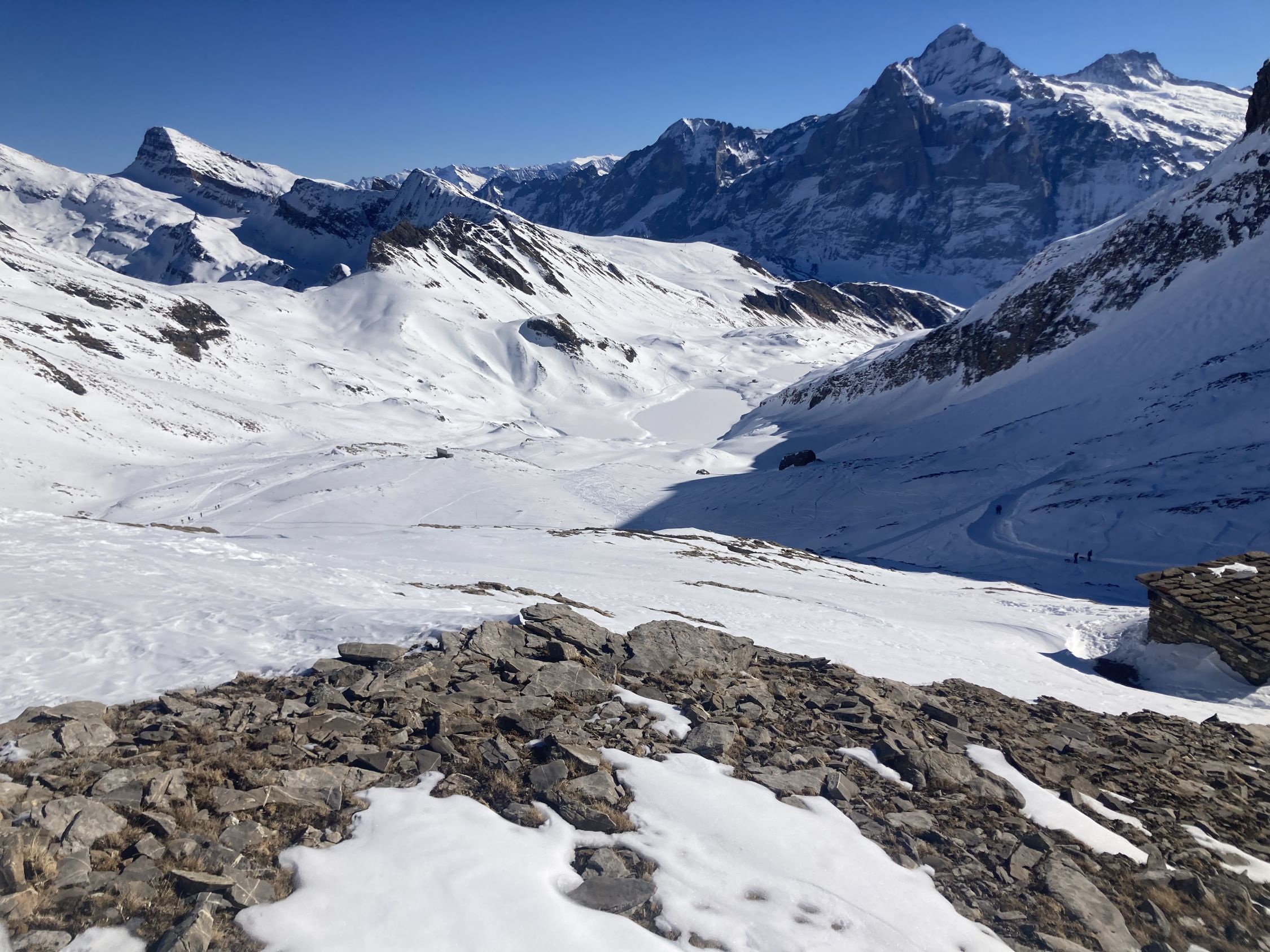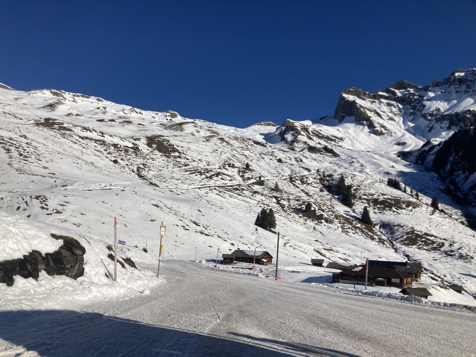 Abfahrt über Bachsee zur First geht recht gut & ohne Steinkontakt. Ab First habe ich die Piste bis zur Zwischenstation Bort genommen + von dort mit der Gondelbahn nach Grindelwald. Die direkte Talabfahrt nach Grindelwald ist im Moment ab First nicht mehr möglich. Aktuell wäre aber gemäss Webseite der Jungfraubahnen die Piste #22 Grindel (Talabfahrt bis Stählisboden) offenbar noch offen.