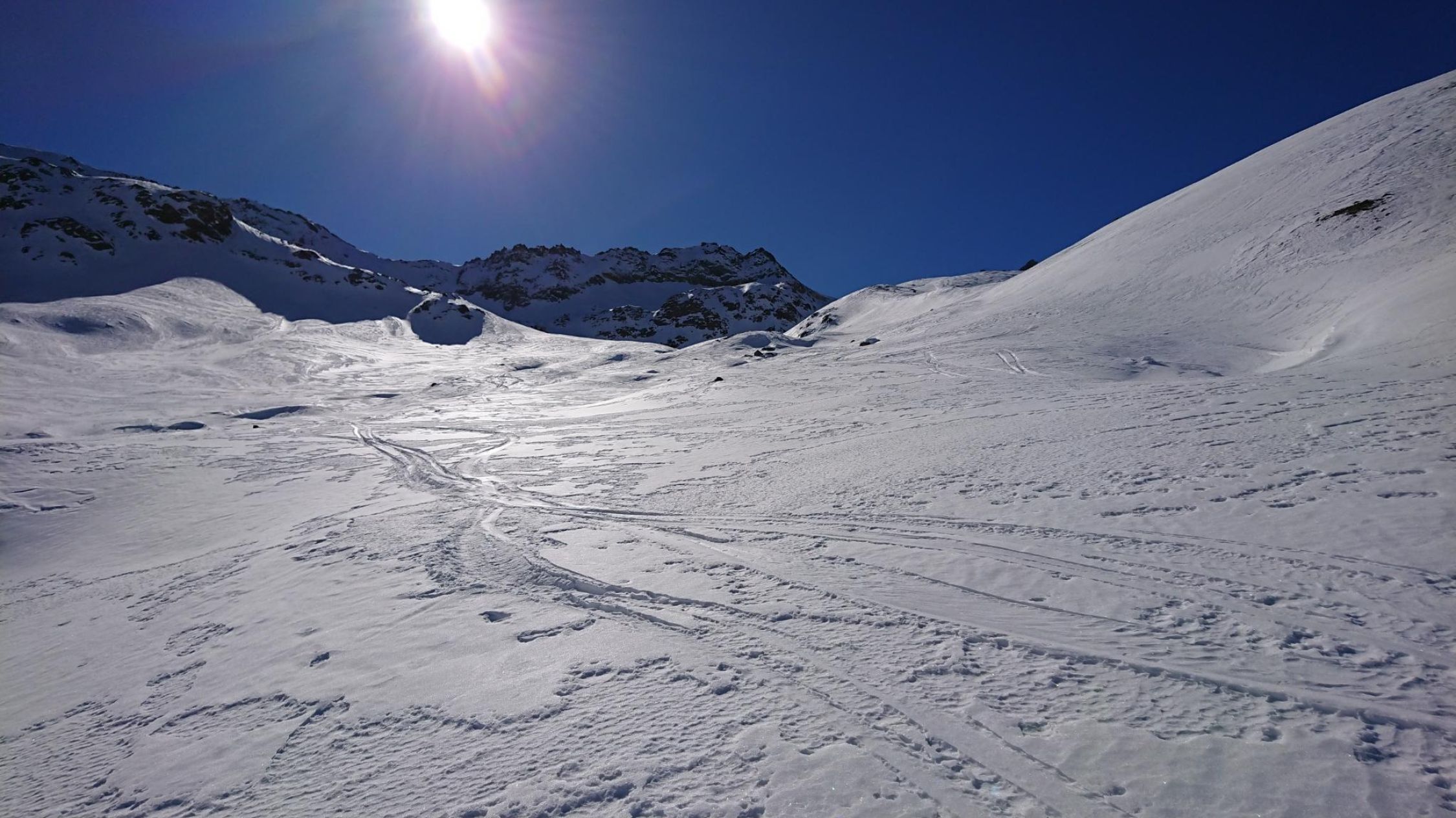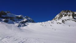 Die Abfahrt durch das Val Bever war erstaunlich gut. Hier liegt deutlich mehr Schnee und es sind nur wenig Steine im Weg. Der Schnee wechselt zwischen hart, gepresst und pulvirg. Insgesamt eine recht gute Abfahrt bis zum Bach. Wiederaufstieg zur Chamanna Jenatsch im Südhang auf wenig Schnee aber gut machbar.