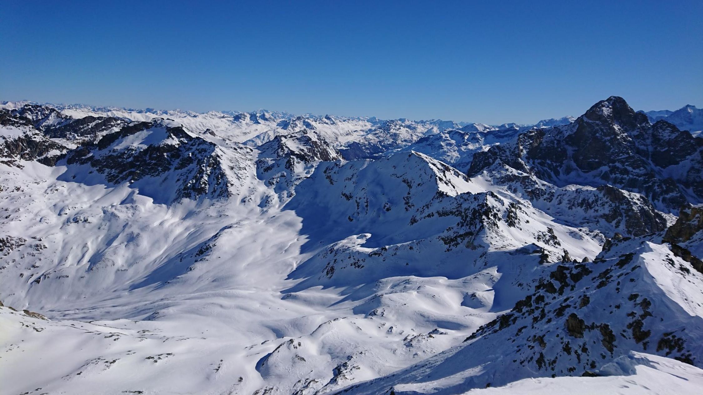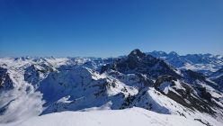 Im Aufstieg ist es teilweise hart und wir haben die Harscheisen montiert. Durch den Gletscherrückgang am Piz Surgonda ist es nun ein kleiner Fussaufstieg zum Grat hoch. Es ist relativ steil, aber es ist eine gute Spur vorhanden. Der Grat zum Gipfel ist ebenfalls hart aber gut zu begehen. Allenfalls sind Steigeisen von Vorteil. Das Panorama vom Gipfel war wieder mal bombastisch: Piz Bernina, Ortler, Matterhorn, usw. :-)