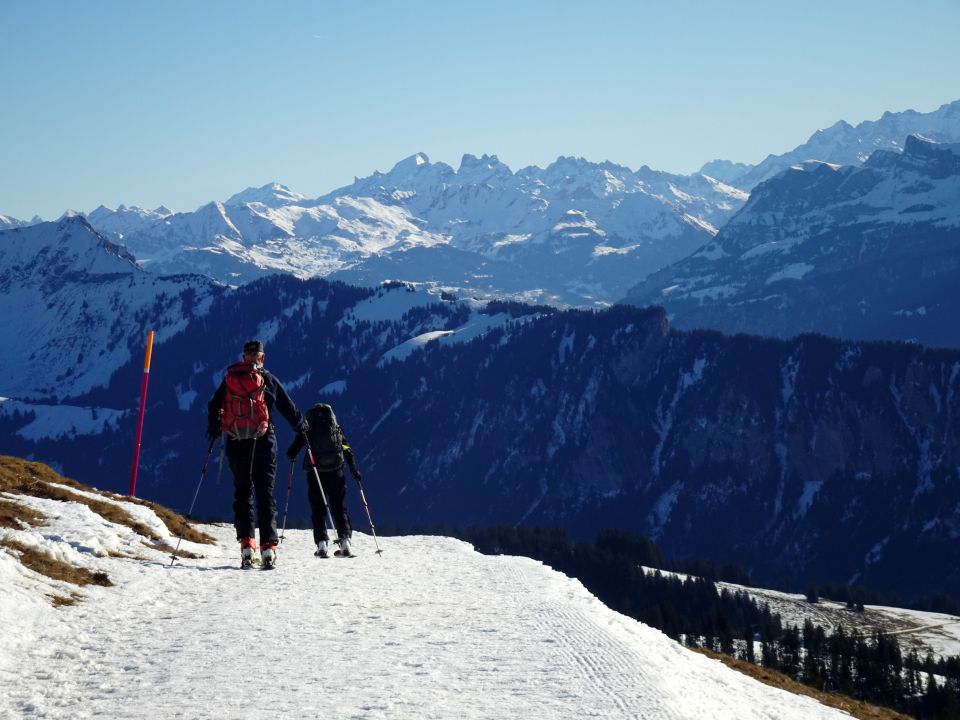 Ohne Neuschnee werden die Trittlöcher mühsamer. Die Bahnangestellten raten von einer Begehung des Verbindungsweg zum Gemmenalphorn an Vormittag (Eisig gefroren) ab.