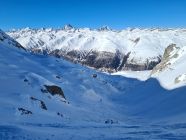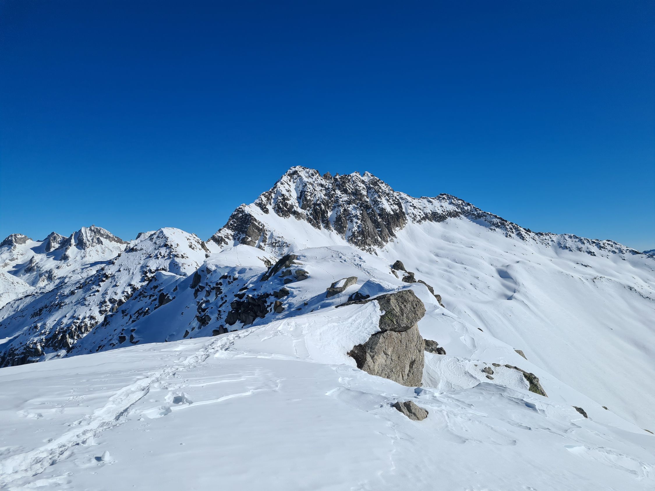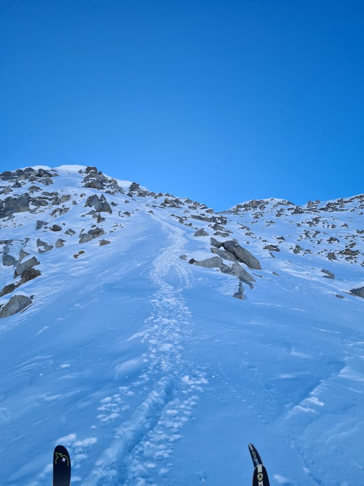 Wir sind bis zum Punkt 2736 (Sattel) gelaufen, sonder beim Übergang unter dem Punkt 2665 haben wir die Ski deponiert und sind die Wand hoch zum Grat. Es ist guter Trittschnee und mit einem Stock und einem Pickel gut zu bewältigen.