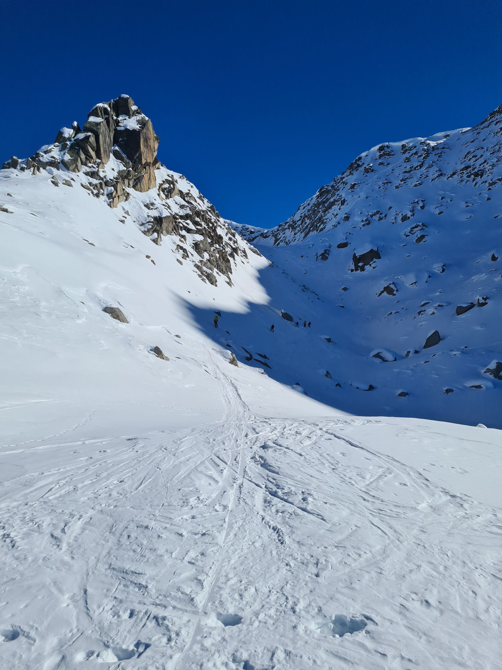 Auf der Normalroute in den Sattel hat es einen Felsen den man übersteigen muss und fast zu wenig Schnee. Eine Dreiergruppe hatte so seine Mühe dort.