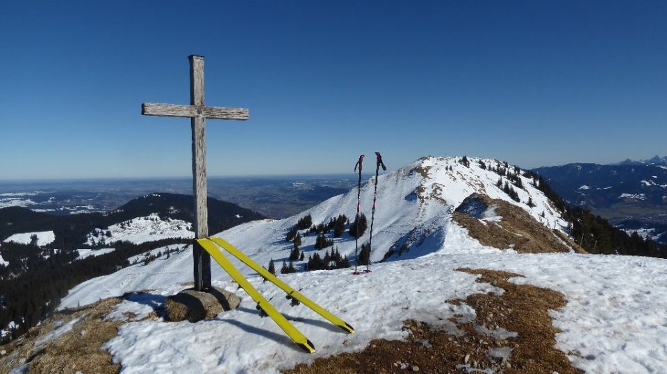 Problemlos auf Loipe und Strasse ins Autal bis Vorsäß III. Der Güterweg zu den Wieslealpen bekommt langsam Lücken (vor 2 Tagen war es noch gut). Der Südhang zur Gatteralpe hoch ist fast Aper. Auf Sommerweg kann man sich noch hochschwindeln. Habe die Betonrampe getragen, wollte meine neuen Felle nicht ruinieren. Oben noch o.k., letzte Meter Aper (ist dort üblich). Abfahrt über NO-Hang ziemlich verfahren mit Stellen von Pulver, Wind bearbeitet, hab ich schon besser angetroffen. Wiederanstieg zum Stuiben noch gut. Dafür Abfahrt nach Süden in Rothen Kessel ungefähr im Bereich des Sommerweges, war die Belohnung. Im besten Sulz konnte der "Alte Herr" auch mal den "Fürscht Leiner"(munartl.) geben. Die steile Runse im nassen Schnee runter nach Ornach war dann echter Krampf mit Ski. Nach Vorsäß III weiter mit mehreren Unterbrechungen. Darum nur Gut, der Tag als solches Wetter, Fernsicht war natürlich ausgezeichnet.