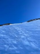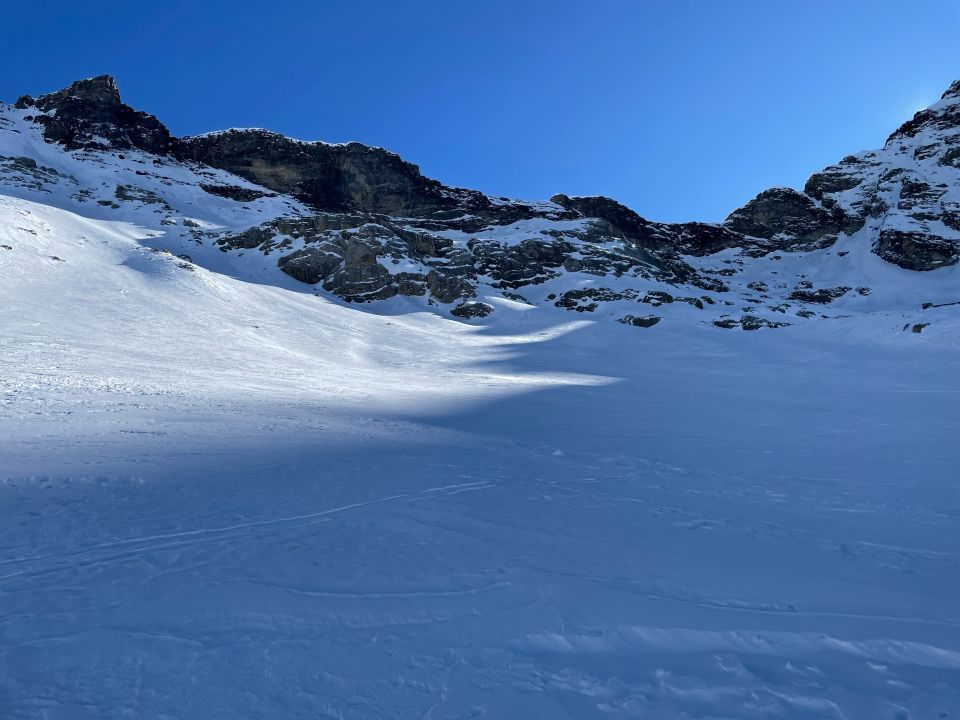 Ab Berstation Tossenlift südwestwärts unter dem Felsband gequert und schnell auf eine gute Spur gestossen. Ich bin im letzten Drittel unter dem Felsband von der offiziellen Sk-Route abgewichen und einer schwach sichtbaren aber direkteren Spur durch das Band gefolgt. Ging gut. Die letzten Meter zum Couloir steil und ausgesetzt, aber auf guterSpur und Schnee auch ohne Harscheisen unproblematisch.