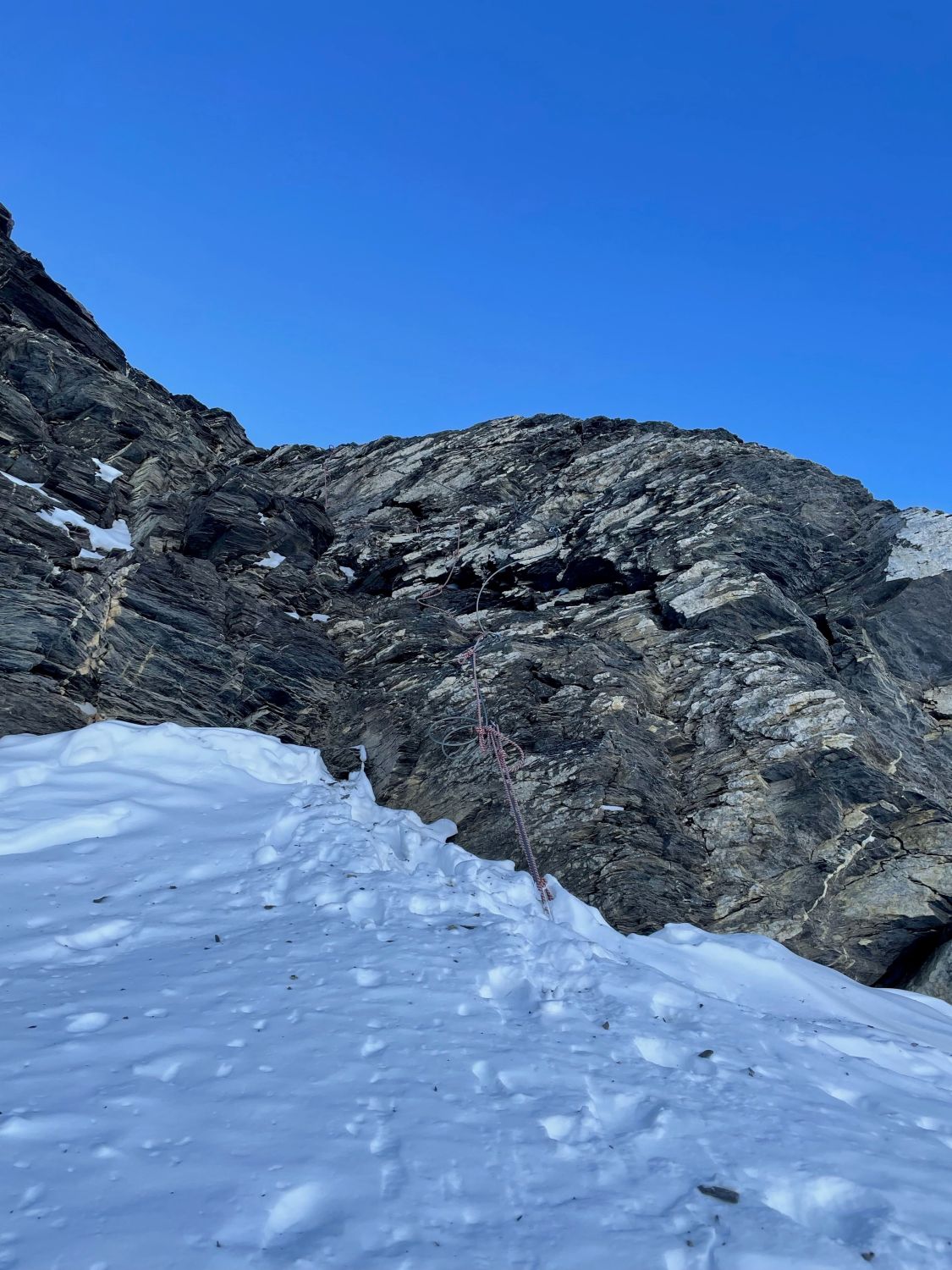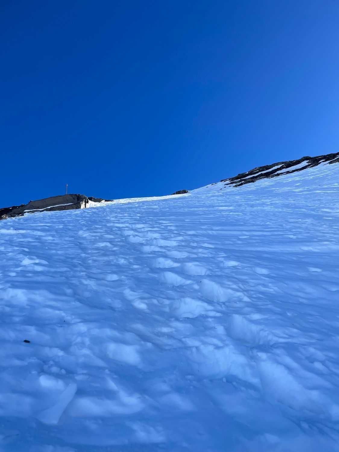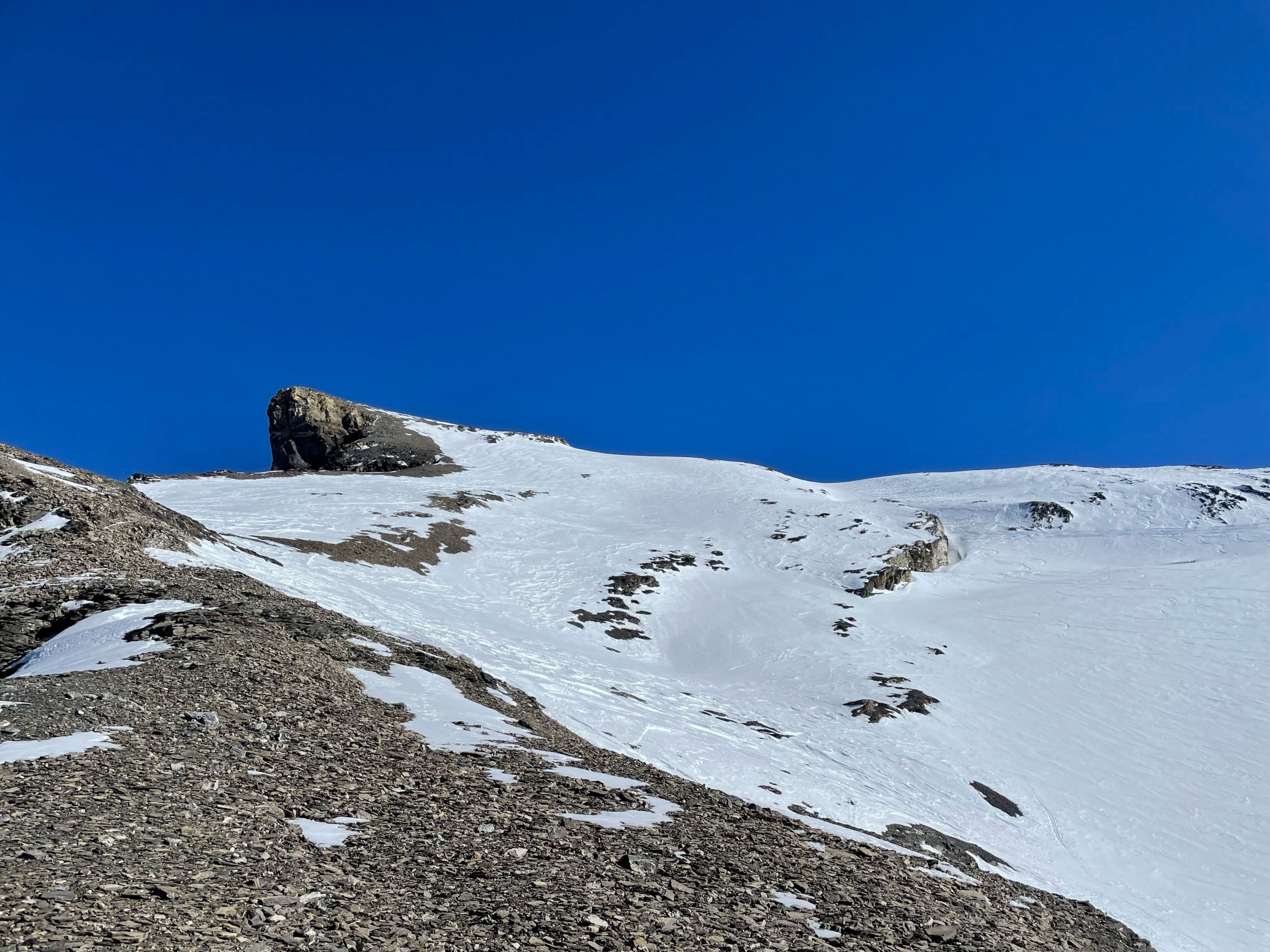 Von der Lücke bin ich zu Fuss/mit Steigeisen an der Schnee/Schuttgrenze am Grat auf den Gipfel. Eher mühsam. Besser wohl ein paar Meter auf den Steghorngletscher absteigen und mit den Skiern hoch. Es hat durchgängig Schnee bis zum Gipfel.