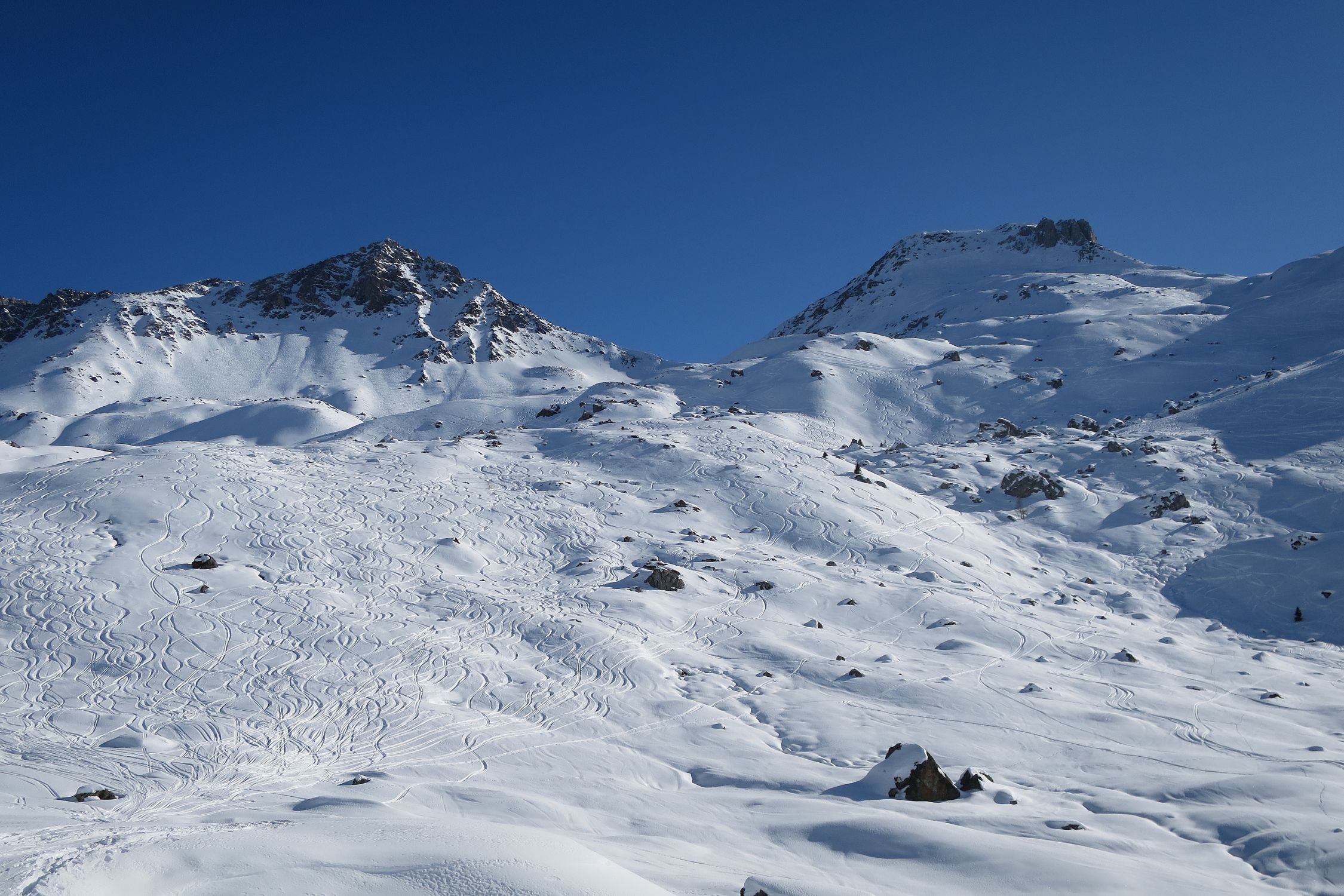 Einstieg in die steile Abfahrt etwas eisig, aber machbar. Weiter unten dann noch sehr schöne (zum Teil unbefahrene) Pulverhänge. Guter Pulver bis Barga. Dann via Duranna Pass zur Gondelbahn Schifer, wo wir noch rechtzeitig vor 16.00 die Bahn erwischten.