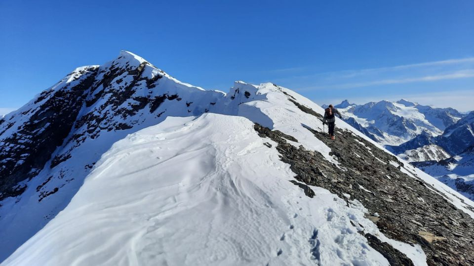 Genügend Schnee ab Juf. Wollten eigentlich Überquerung machen, oben aber stark windverblasen, nur zu Fuss machbar. Wir sind nicht die offizielle Skiroute gegangen, sondern vom Piotjoch dirket in den Nordgrat eingestiegen und dann kurz vor den Felsen rechts den Hang gequert. Ging ganz gut.