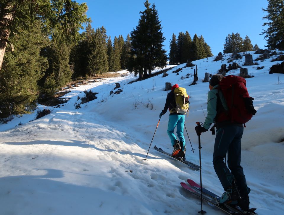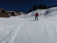 Schnee wird im letzen Hang bald knapp, über Alpweg hinauf schon einige Tragstellen, oben dann ok.