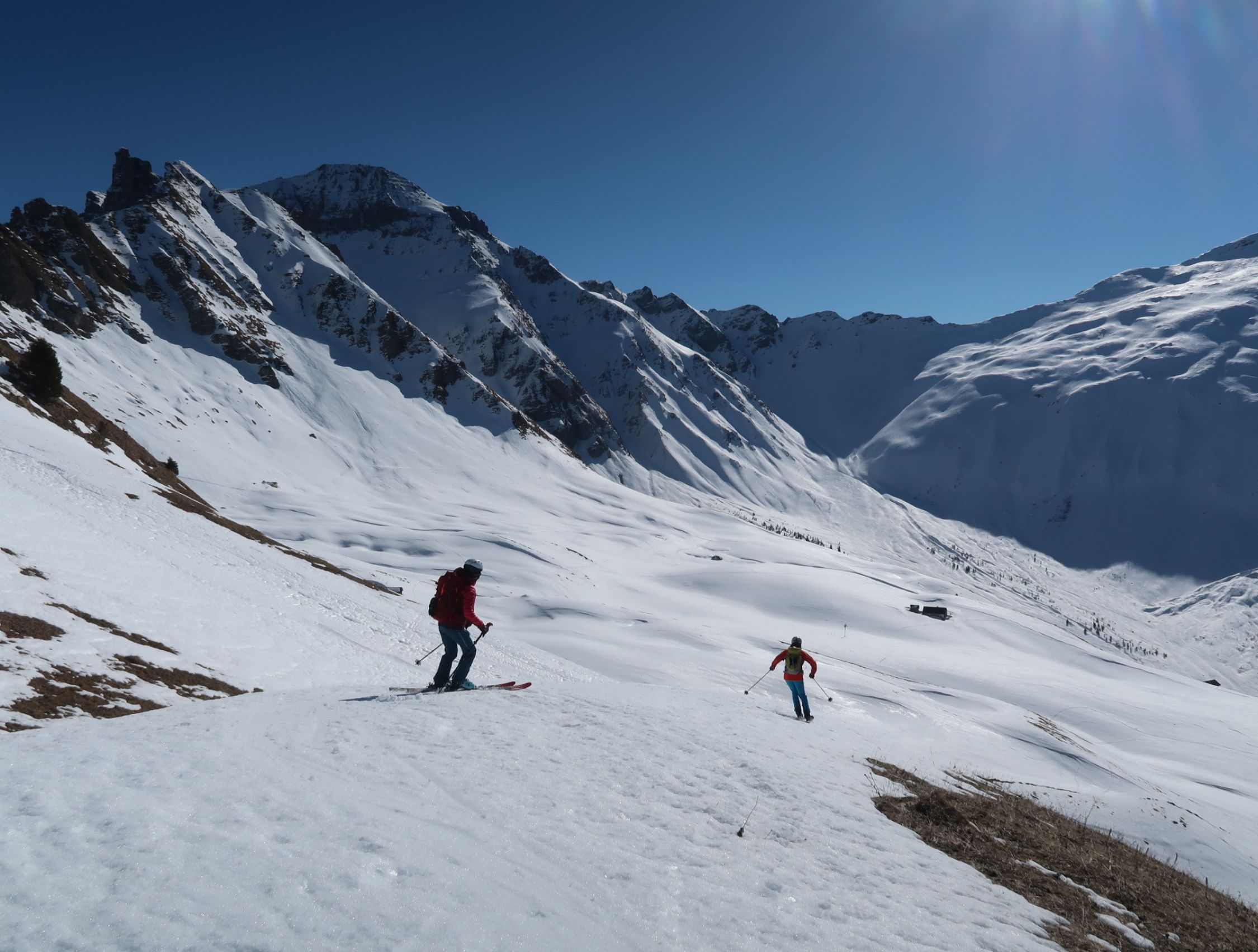 Am Morgen gefroren, dann um 12 Uhr für die Abfahrt Sulzschnee (über den Rücken östliche Trüellouene) direkt runter ins Färmeltal noch durchgehende Schneedecke