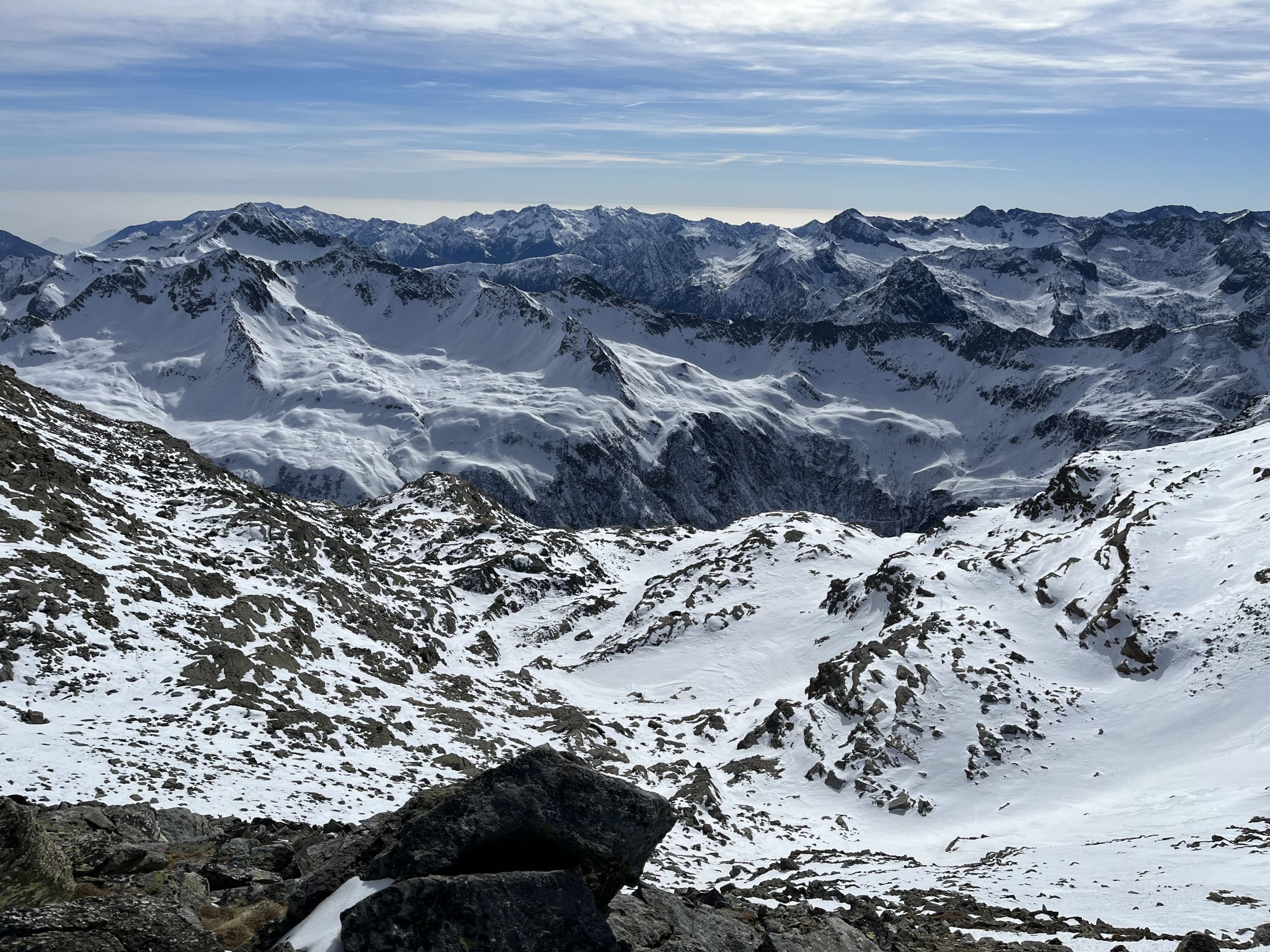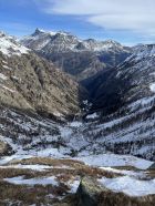 Im Aufstieg geschlossene Schneedecke ab Laggin, Schnee recht inhomogen. Gegen oben dann meist hart. Aufstieg somit ganz ordentlich.