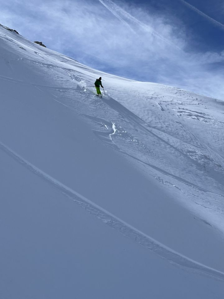 Aufstieg via Val Peja gute Spur, genügend Schnee. Abfahrt über die Nordflanke bis 2350 m, dann zur Normalroute traversiert. Oben noch einig Schwünge Pulver, sonst alle Arten von Schnee. Unten wird’s schon sulzig, wenn man spät genug dran ist. Schnee unten knapp, aber geht gerade noch.