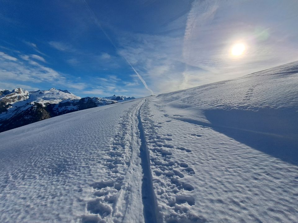 Auf dem Weg im unterten Teil muss man die Skier 10min tragen und es wird länger. Sonst genügend Schnee auf dem Weg. Gute griffige Spur bis zum Mattner First. Oben viel Wind und wir sind gleich wieder abgefahren. Je nach Ausrichtung verschiedene Schneearten angetroffen. Im grossen und ganzen genügend Schnee im Gebiet.