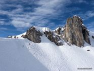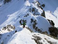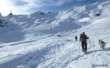 Abfahrt: Wir sind auf der NO Seite abgefahren. Es hat schon viele Spuren drin. Auch in den Schattenhängen macht die Abfahrt keinen Spass, wechselhaft, wuppig, Deckel. Ganz wenige Stellen sind etwas pulverig. Ab Mätz ca 1850 m hats eine aufgesulzte schmale Piste. Sie ist im Vergleich zum oberen Teil schon fast genussvoll zu fahren. Auf der ganzen Tour hatten wir keine Boden-/Steinkontakte.