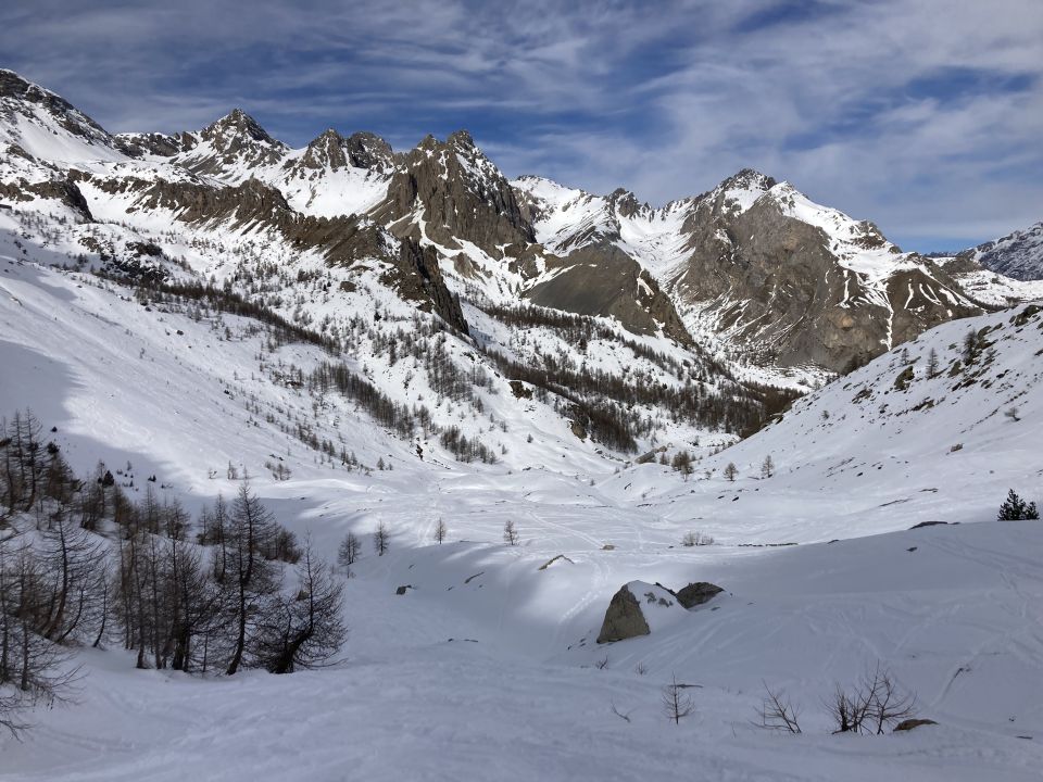 Grundsätzlich hat es auch im Maira-Tal derzeit eine eher dünne Schneelage und der letzte Schneefall ist schon etwas her. Trotzdem findet sich in hohen Lagen in den Schatthängen noch Pulverschnee und auf den Sonnenseiten gibt es zur richtigen Tageszeit den ein oder anderen Firnschwung. Auf der Tour gab es den Firn auf der Abfahrt zum Passo della Gardetta und den Pulver auf der Nordabfahrt vom Colletto Emanuel.