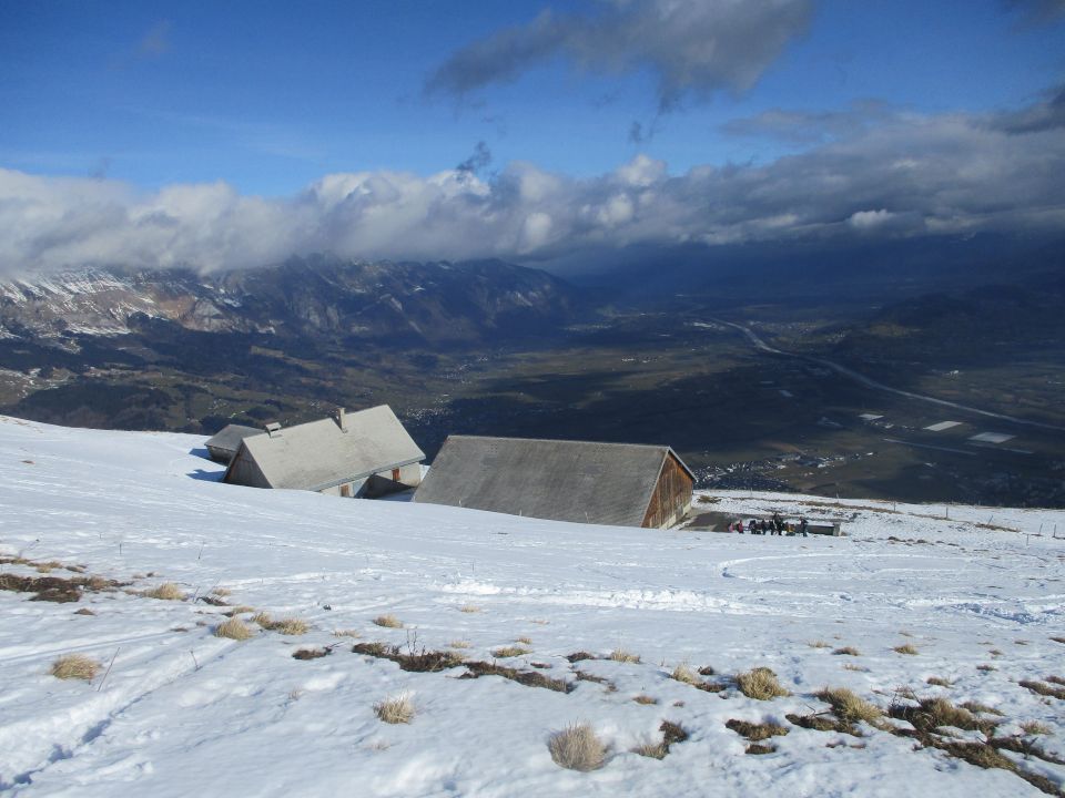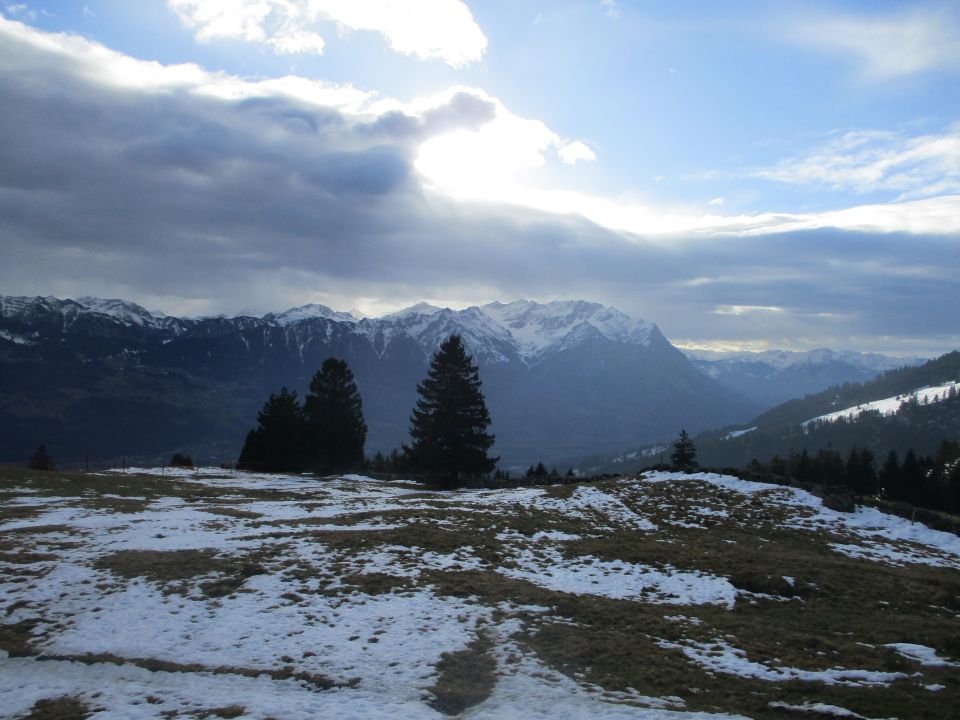 Die Schneelage war natürlich dürftig. Mit Schneeschuhen ist das ja kein Problem, aber Vladi mit seinen Skiern musste im Aufstieg ein paar mal bei kürzeren aperen Passagen abschnallen. Die Abfahrt ging seiner Aussage nach mit etwas Umsicht unerwartet gut, und zwar bis hinunter zum Parkplatz.