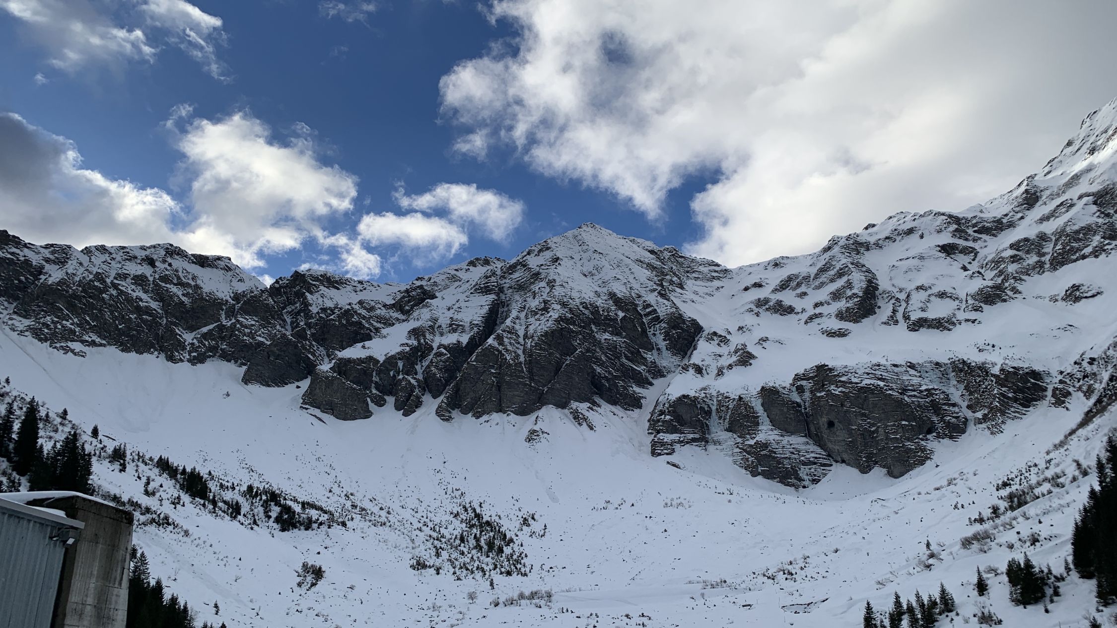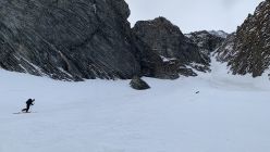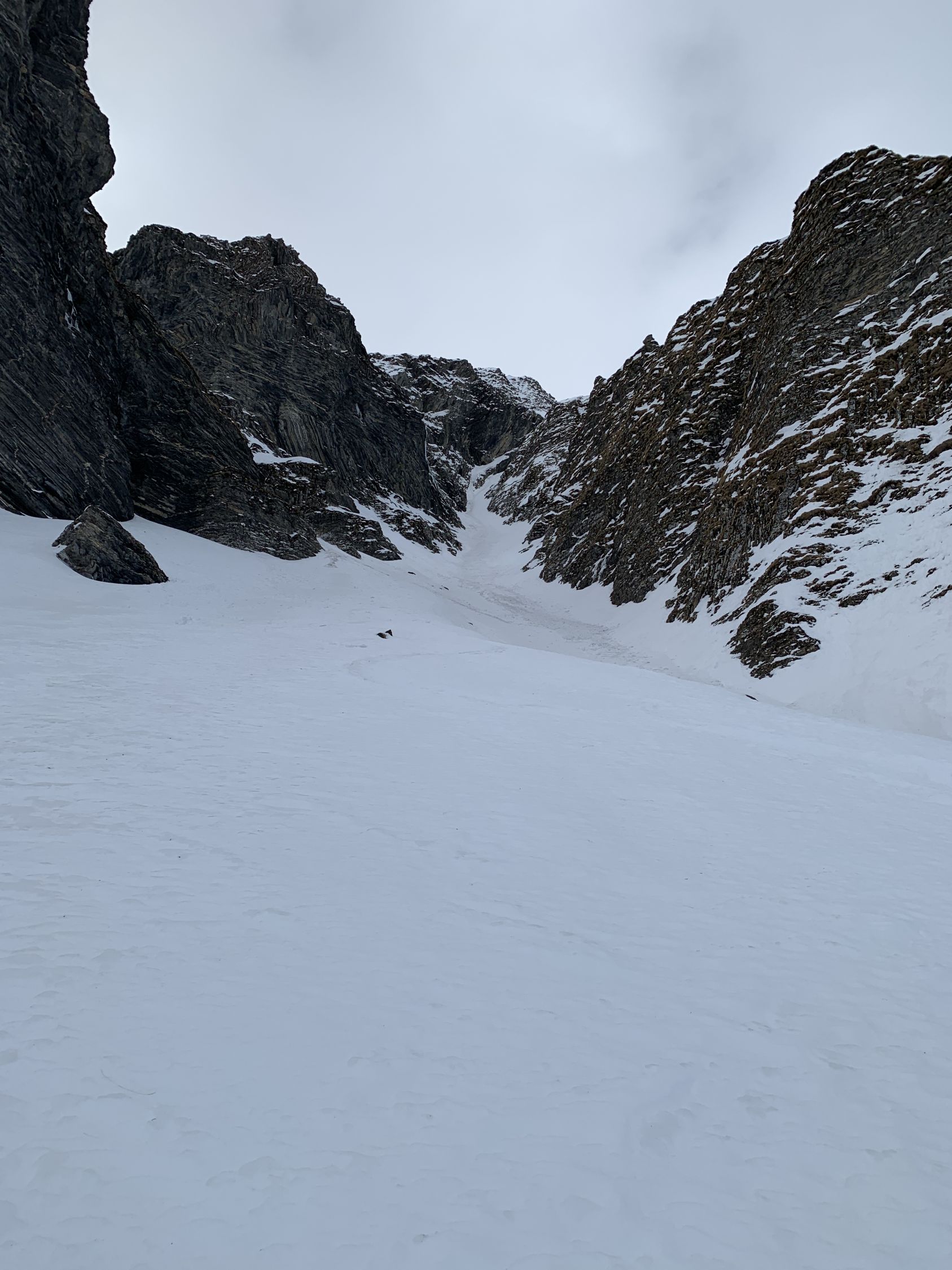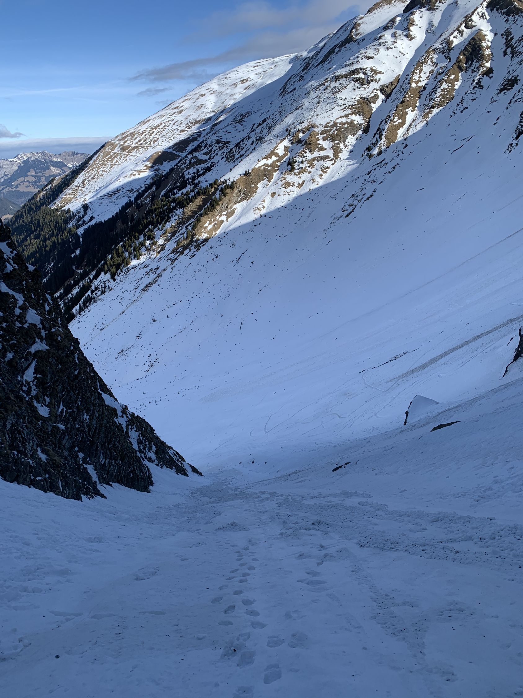 Wir haben beim Ausstieg aus dem Couloir abgebrochen. Der Aufstieg bis dahin geht gut, die Schuhe brechen ca. bis zur Mitte durch. Der Ausstieg hat wenig Schnee und erscheint steiler als auch schon. Zudem hat es beim Ausstieg unter einer kleinen Kruste doch lockerer Schnee und man bricht mehr durch. Der Ausstieg mit Ski erschien uns nicht besser oder sicherer.