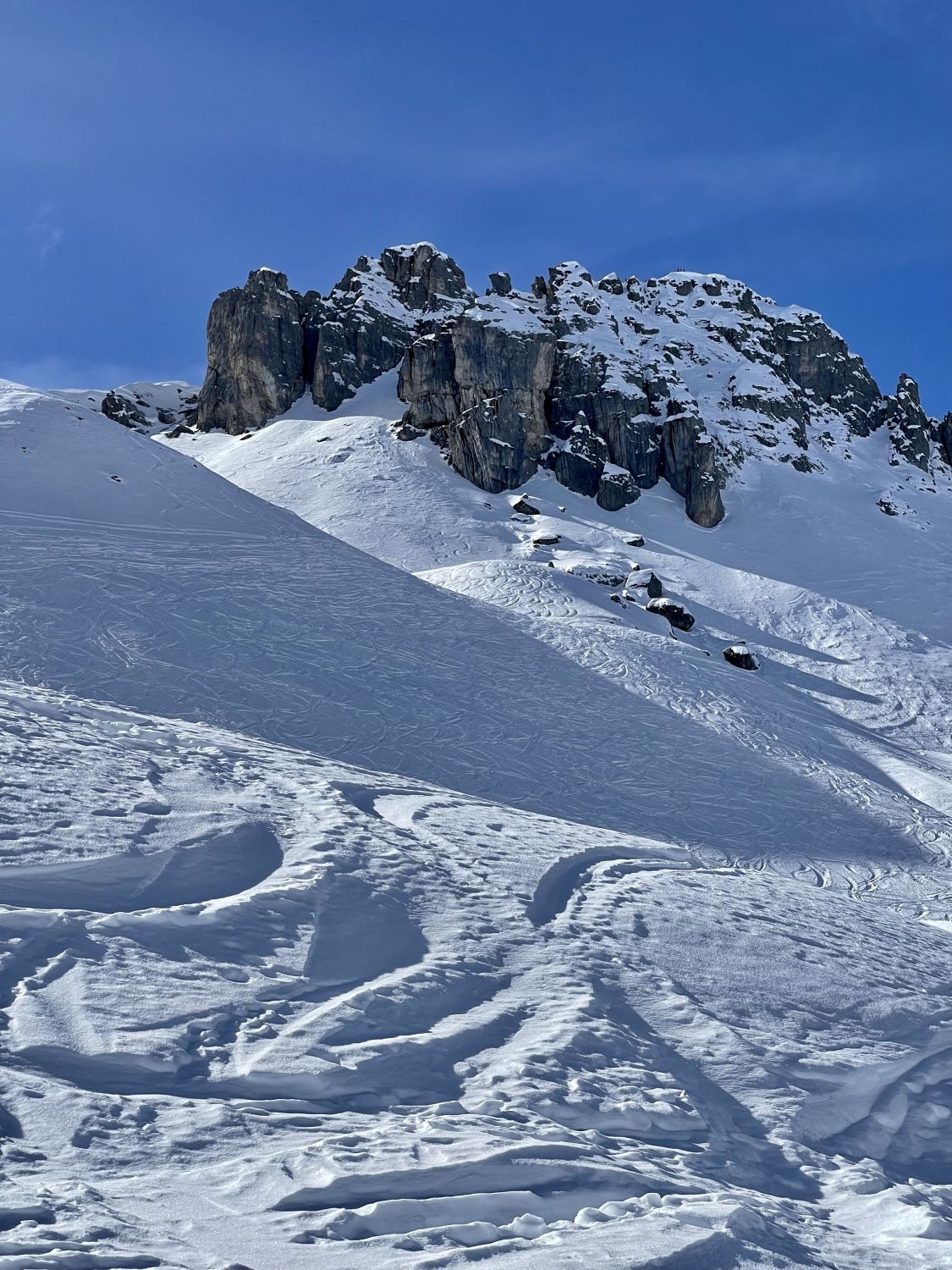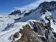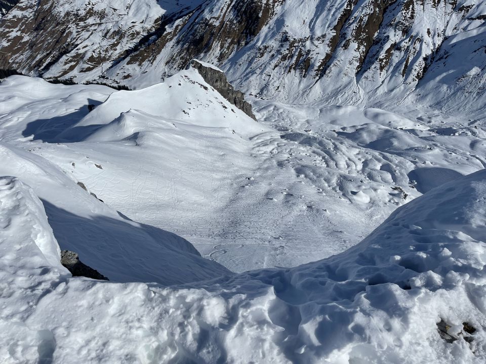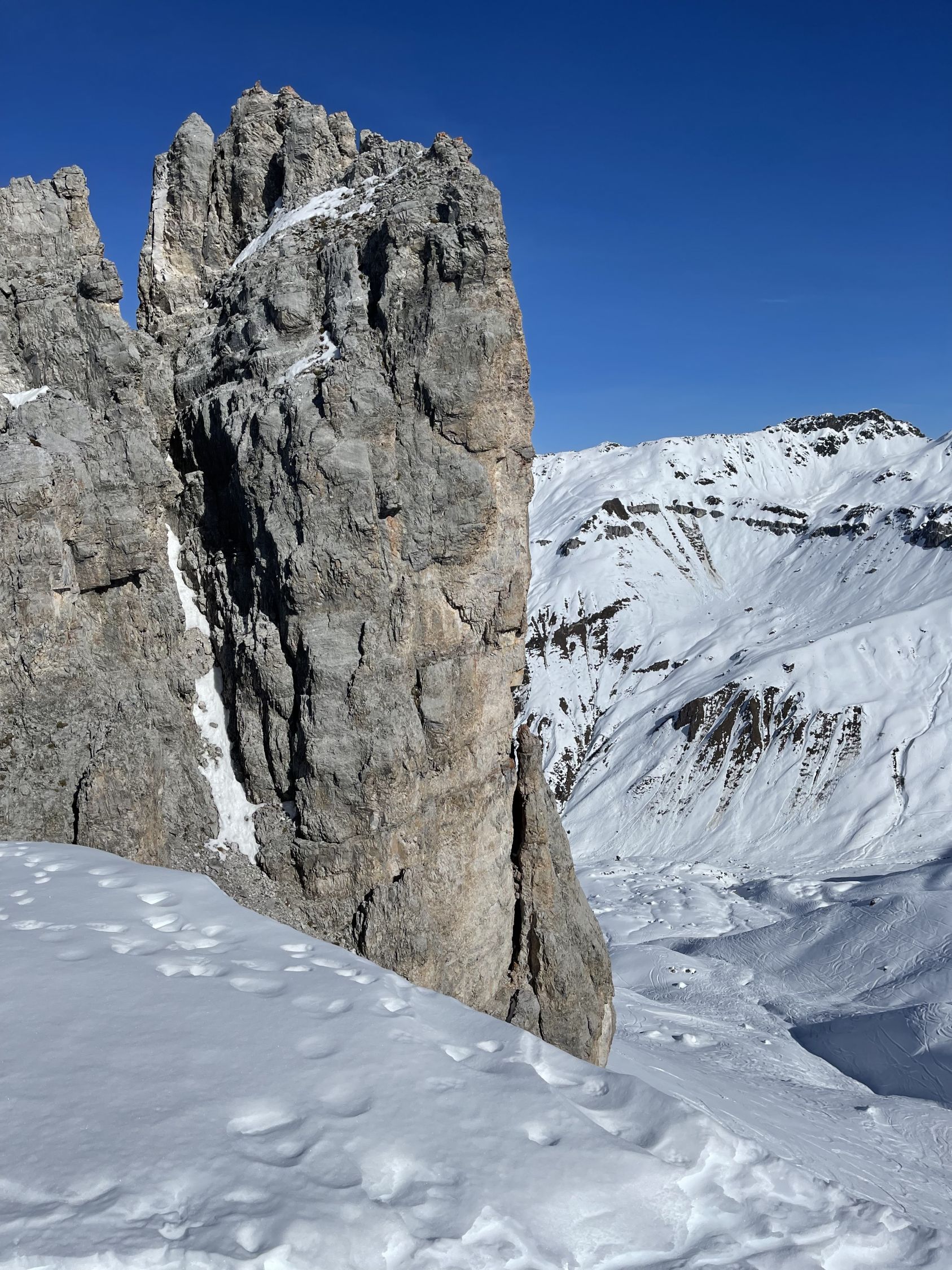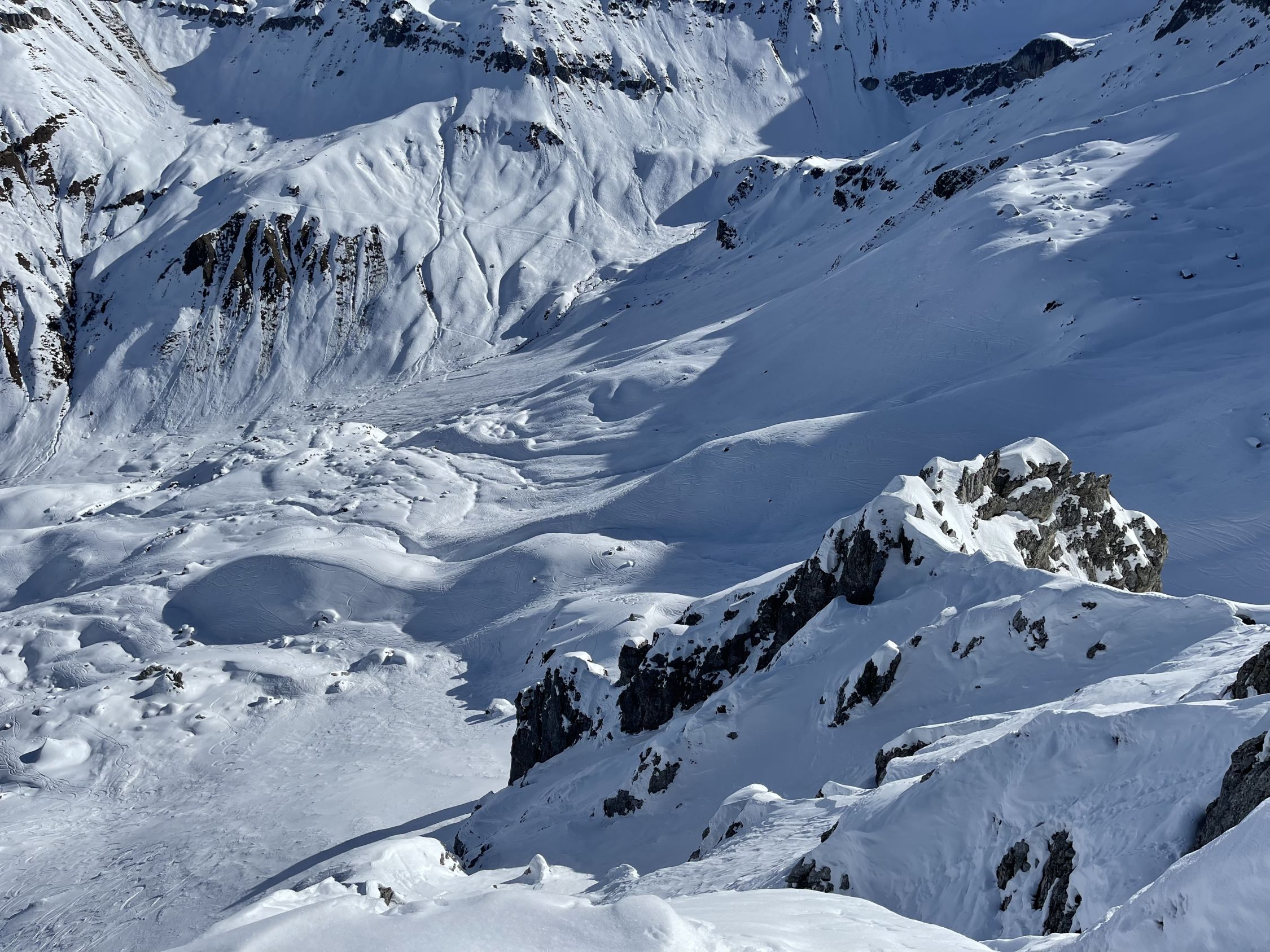Ich bin über die südliche Variante abgefahren, da gabs im Schatten doch tatsächlich noch Pulver, und die Szenerie ist dort wirklich dolomitenmäßig schön, dann recht weit oben über den Bach und auf der Sonnenseite runter, der Aufstiegsspur des Gafiatals folgend, sehr vergnüglich zurück zum Auto.