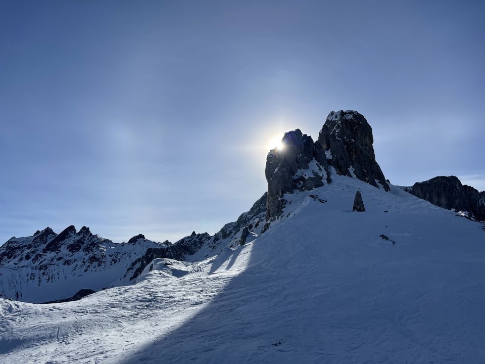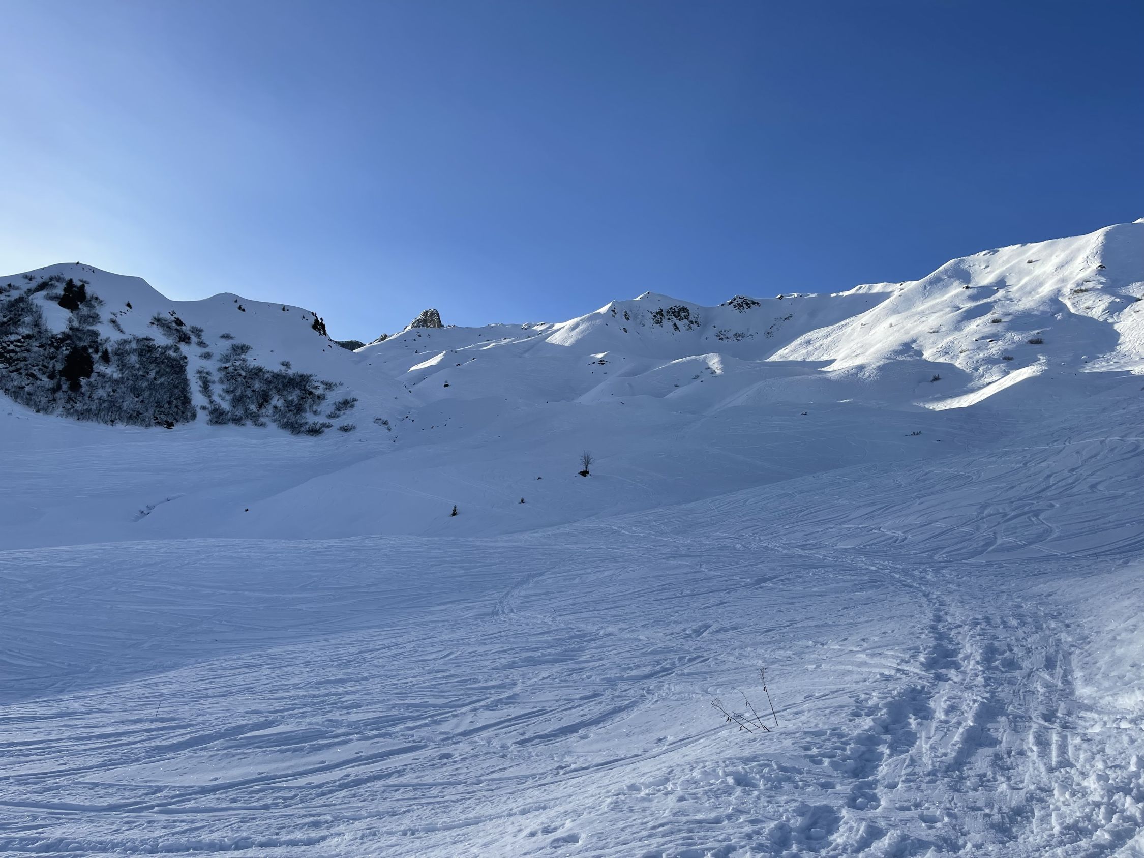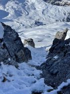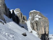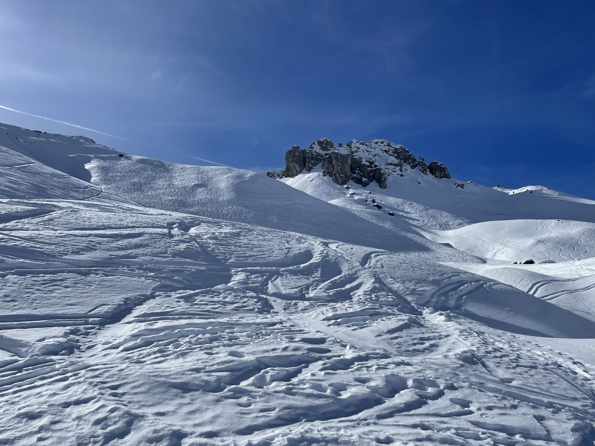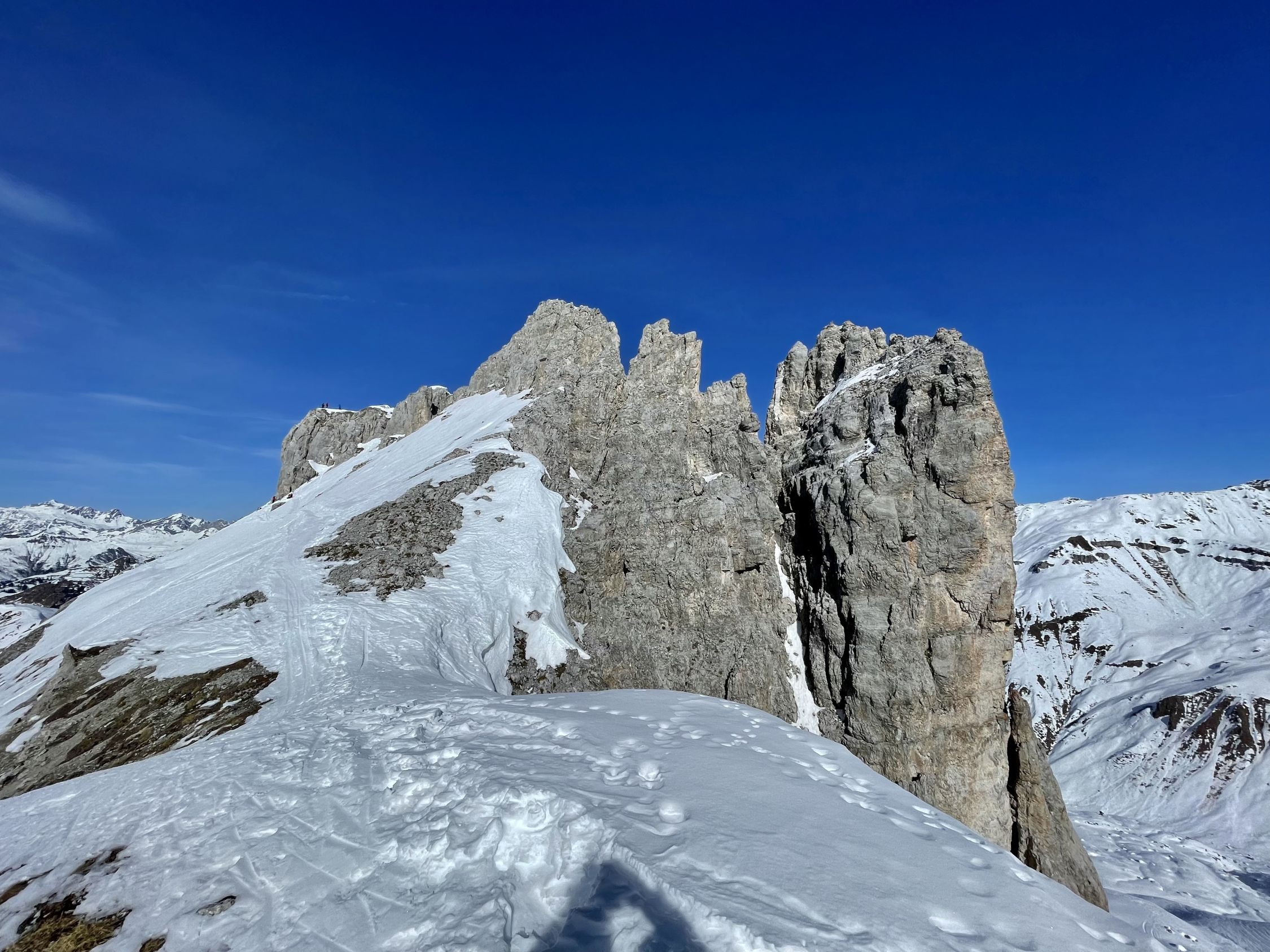 Ich bin über die südliche Variante abgefahren, da gabs im Schatten doch tatsächlich noch Pulver, und die Szenerie ist dort wirklich dolomitenmäßig schön, dann recht weit oben über den Bach und auf der Sonnenseite runter, der Aufstiegsspur des Gafiatals folgend, sehr vergnüglich zurück zum Auto.