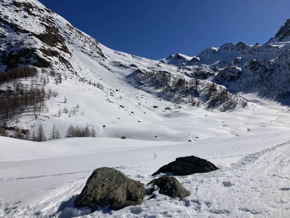 Tour ist bis zum Skidepot gut eingespurt. Auf der Nordseite des Valletta-Talschlusses sowie im Kessel um den Lago Nero / Monte Bert noch guten Pulverschnee. Abfahrt vom Lage Nero nach Westen zur Grange Culauss wird der Schnee unten schon schwer.