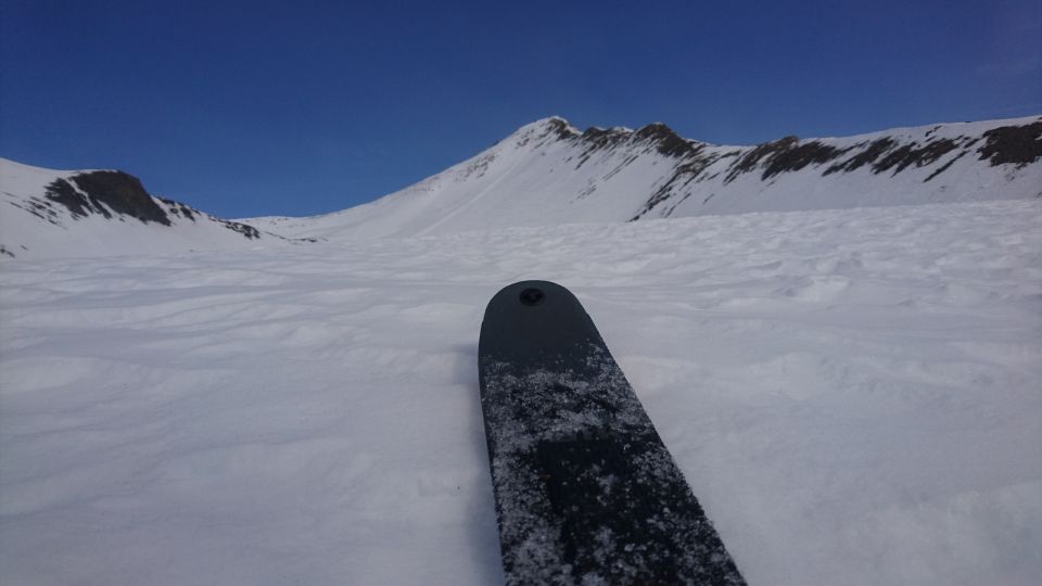 Passstrasse etwa 100Hm schneefrei, danach knapp ausreichend Schnee. Nach Verlassen der Strasse ausnahmsweise ordentliche Bedingungen. Etwas ruppig, aber fast schon Firn. Die letzten 100Hm zu Fuss. Abfahrt vom Gipfel kein Genuss, aber besser als wieder runterlaufen. Weiter unten hats dann Spass gemacht. Danach noch auf den Igl Compass. Dort fehlt tlws echt der Schnee. Weit und breit niemand unterwegs.
