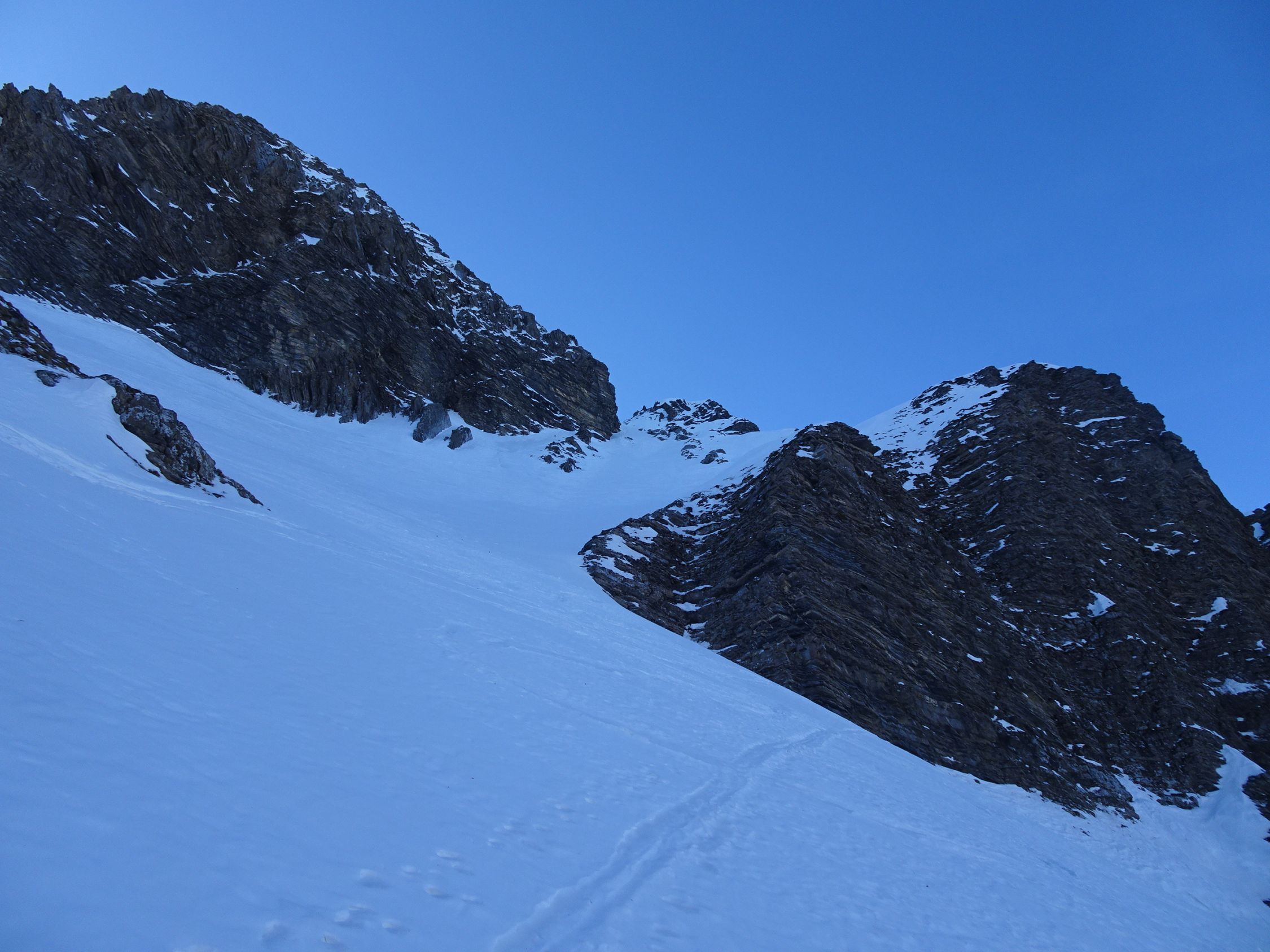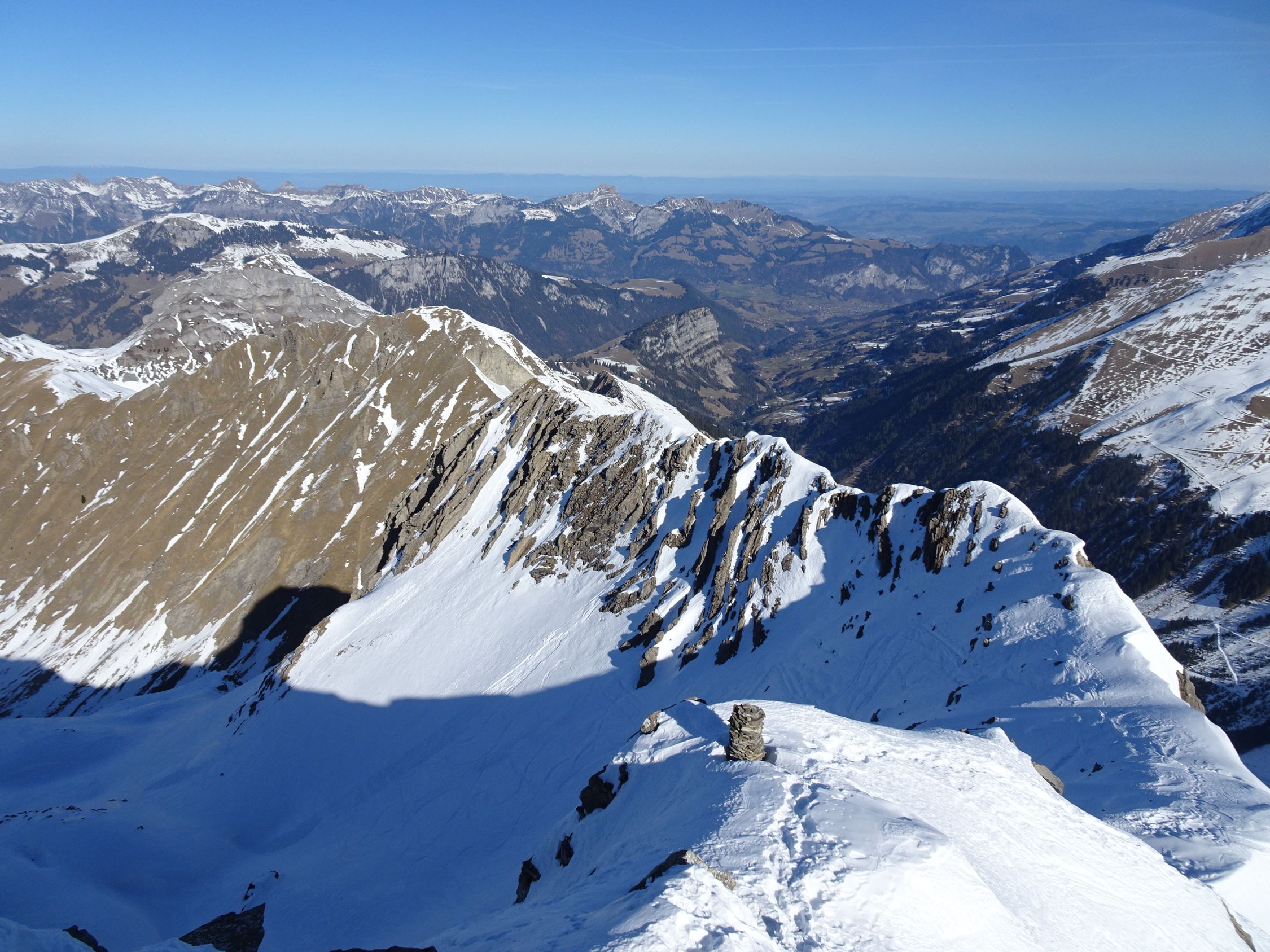 Aufstiegsverhältnisse überraschend gut. Portage bis kurz vor die erste Hütte bei P. 1459 (30min), bis dort komplett aper. Anschliessend alles mit Ski möglich, auch die Steilstufe nach Bütschi hoch. Verhältnisse generell recht griffig. Im Couloir dann streng mit Harscheisen und ohne Steighilfe. Schlussaufstieg zur Schattigi Schibe leicht vereist. Kurze Abfahrt retour, dann problemloser Weiterweg zur Männliflue. Die kurze Gratpassage erforderte weder Steigeisen noch Pickel (so hatte ich ihn nicht vermisst... siehe unten). Auf dem Gipfel wunderbar mild und fast windstill, wolkenlos, was für ein Tag! Etwas später traf von Süden eine weitere Solistin ein, sonst offenbar keine Besucher heute.