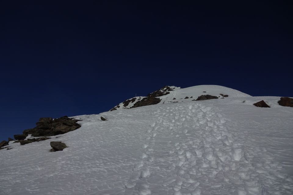 Wir haben im Aufstieg von der Rotondohütte noch das Stellibodenhorn mitgenommen. Dort gute Aufstiegsverhältnisse und gute Spur für den Fussaufstieg. Abfahrt auf dem Muttengletscher hart; man muss die gute Linie etwas suchen. Aufstieg in den Sattel in sehr guter, griffiger Spur. Im Fussaufstieg einige Passagen in trockenem Fels, ansonsten gute Schneespur. In der Abfahrt oben Presspulver, unten Sulz.