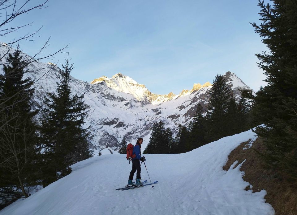 Schnee morgens gefroren, ab der Hütte waren Harscheisen angenehm, ging aber auch ohne. Die steile südseitige Querung war am späten Vormittag schon leicht angefirnt, der westseitige Gipfelhang noch eher hart.