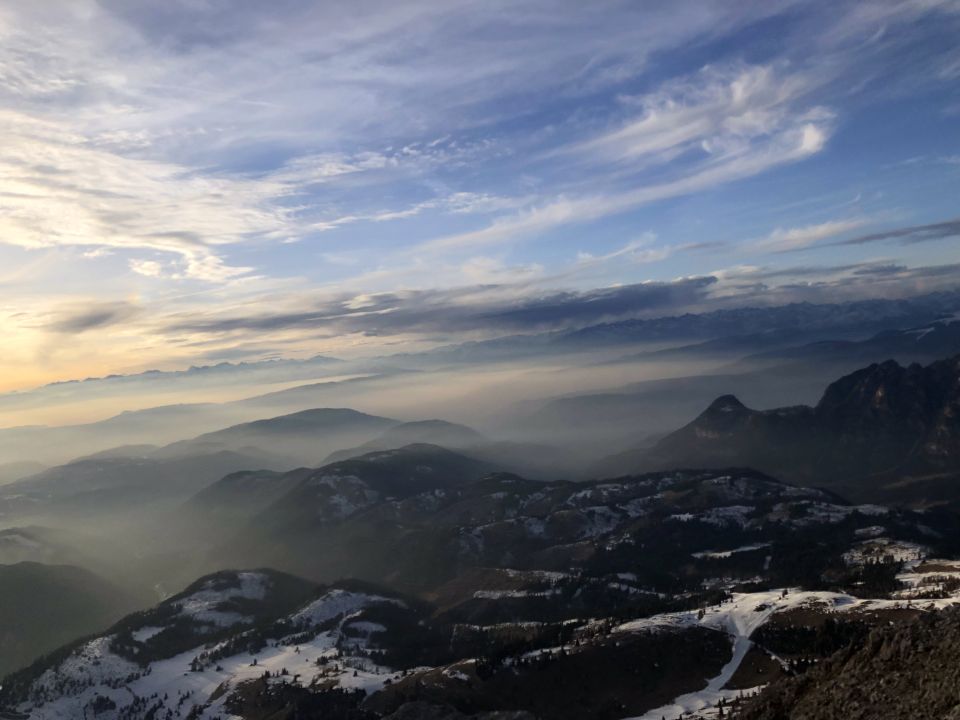 Am Eingang zur Schlucht Skidepot gemacht dann deutlich besserer Trittschnee. Klettersteig mit guter Spur. Steigeisen braucht es. Gipfel um 17:00. Abstieg dann wieder ähnlich mühsam wie hoch weil zu wenig Scnee um abzufahren . Fazit: der obere Teul eine schöne kleine Hochtour. Der untere Teil zum beißen.