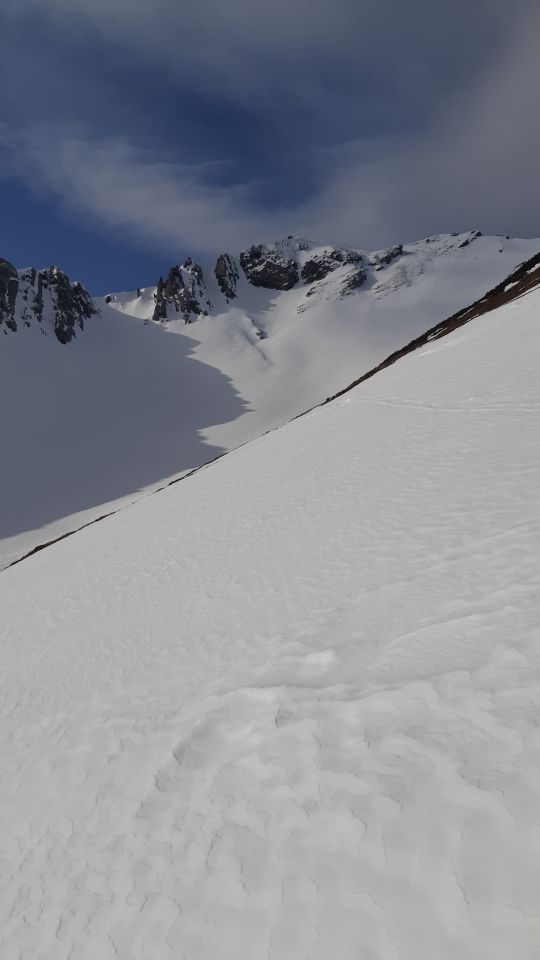 Aufstieg und Abfahrt in Fallinie westlich vom Gipfel. Dort perfekte Firnbedingungen und keine alten Spuren...erst wo die 1000 Spuren vom Blankuskopf dazukommen wird es unruhig aber immer noch gut zu fahren.