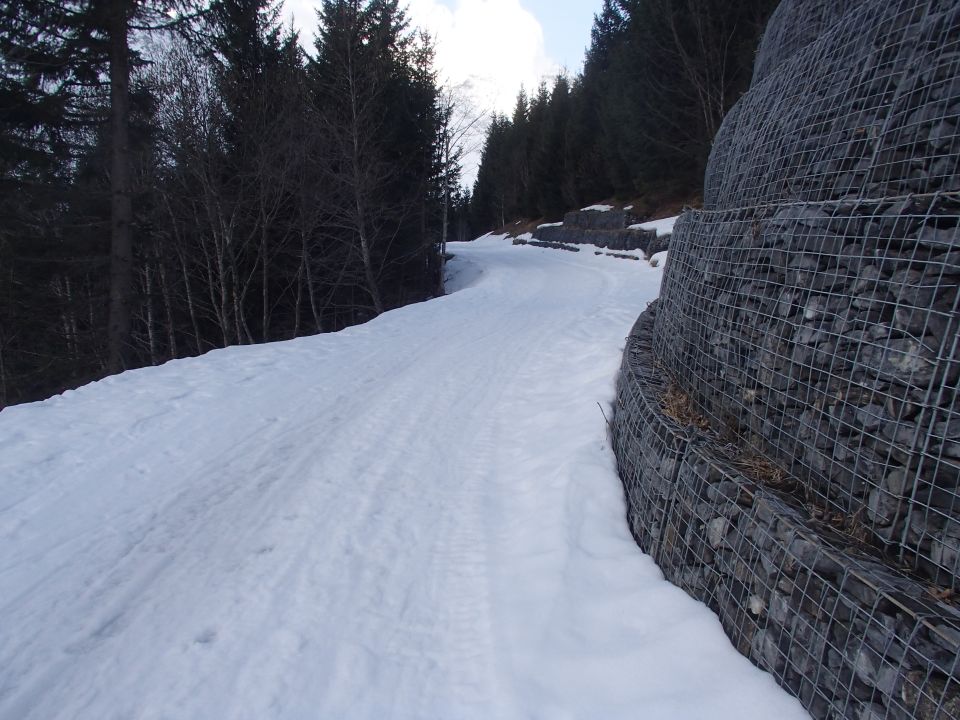 durchgehend Schnee ab Punkt 1261. Eine kurze apere Stelle auf der Forststrasse nach Obererbs. Im Hang oberhalb der Skihütte muss man sich den Weg zwischen den grünen Inseln etwas suchen.