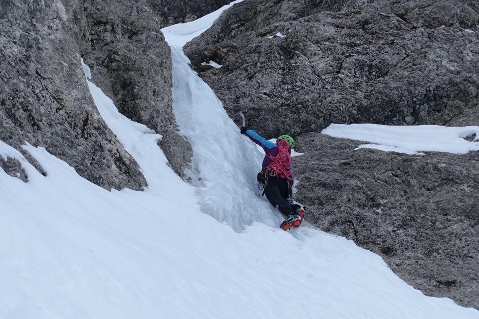 Sehr wenig Schnee in den Felspassagen, dadurch deutlich leichter als im "richtigen" Winter. Eisgeräte kamen nur im Vorbau und im Ausstieg zum Einsatz. Steigeisen und unbehandschuhte Hände waren in den paar schwierigeren SL das Mittel der Wahl.