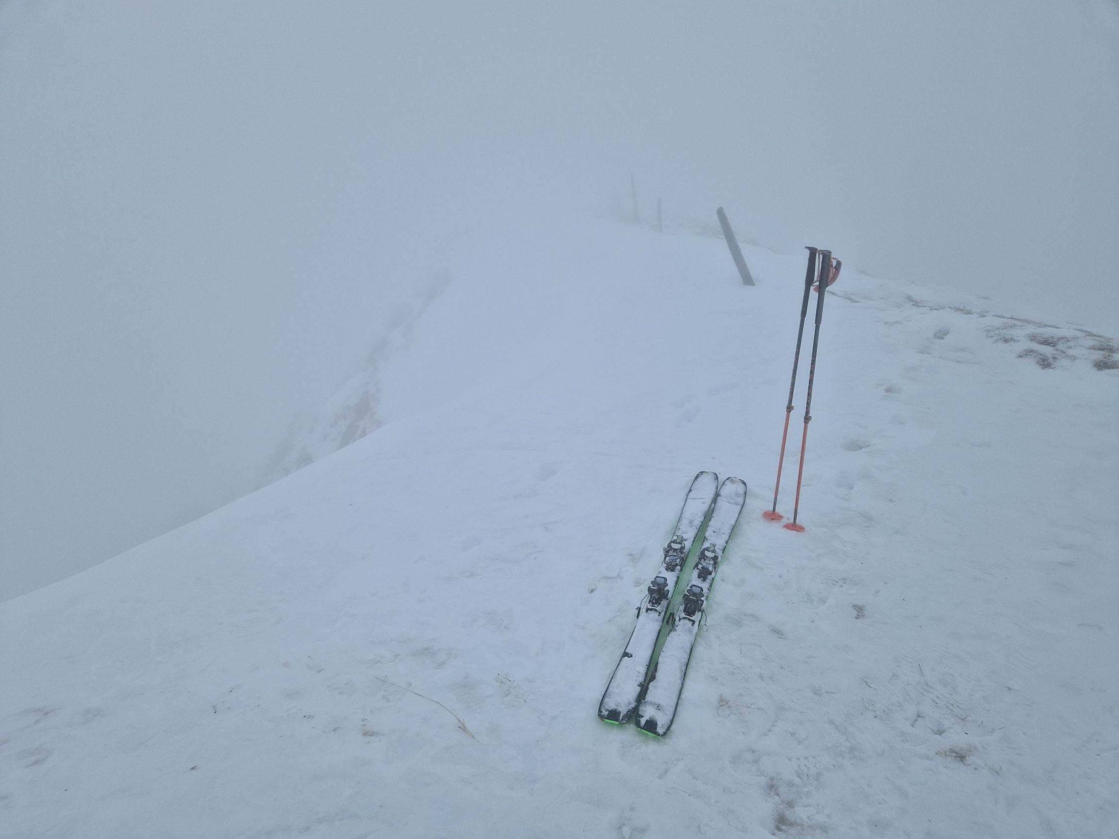 Gute spur und genügend Schnee bis Morgetepass, ab da gerade noch möglich mit Ski aber fast mehr auf Gras als auf Schnee. Gipfel wie fast ganze Route auch im Nebel. Abfahrt durch die Nordflanke, paar cm nasser Neuschnee auf harter Unterlage und zu unterst Bruchharsch, aber es hat noch genügend Schnee bis unten.