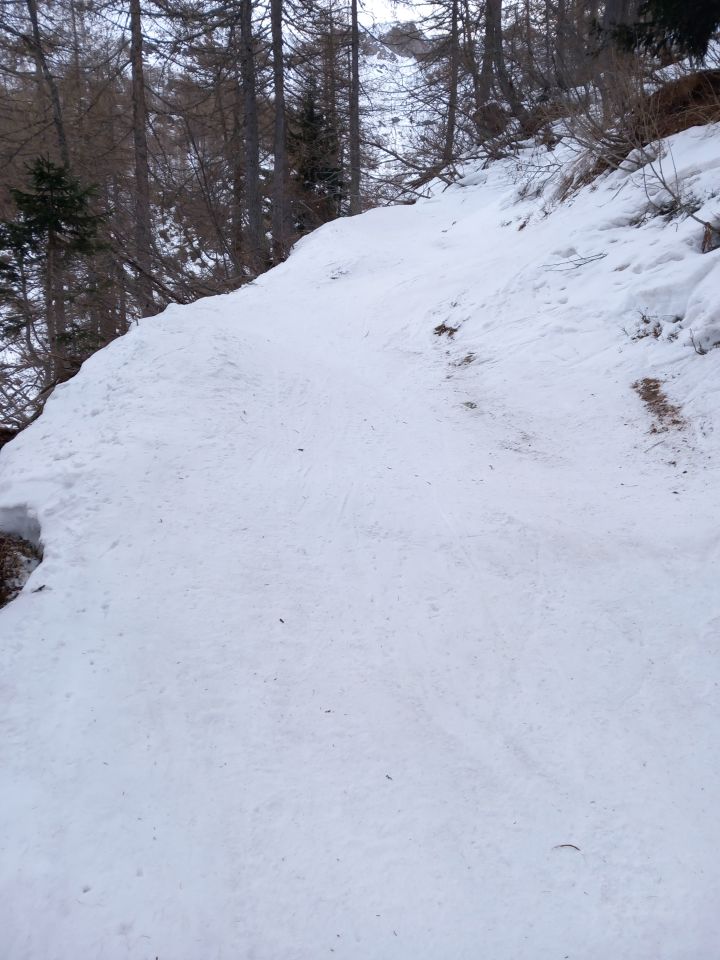 Der Aufstieg auf dem steilen Waldweg gleicht einer Bobbahn, ausgefahren und pickelhart. Ging für mich noch ohne Harscheisen, sie sind aber kein Luxus da.