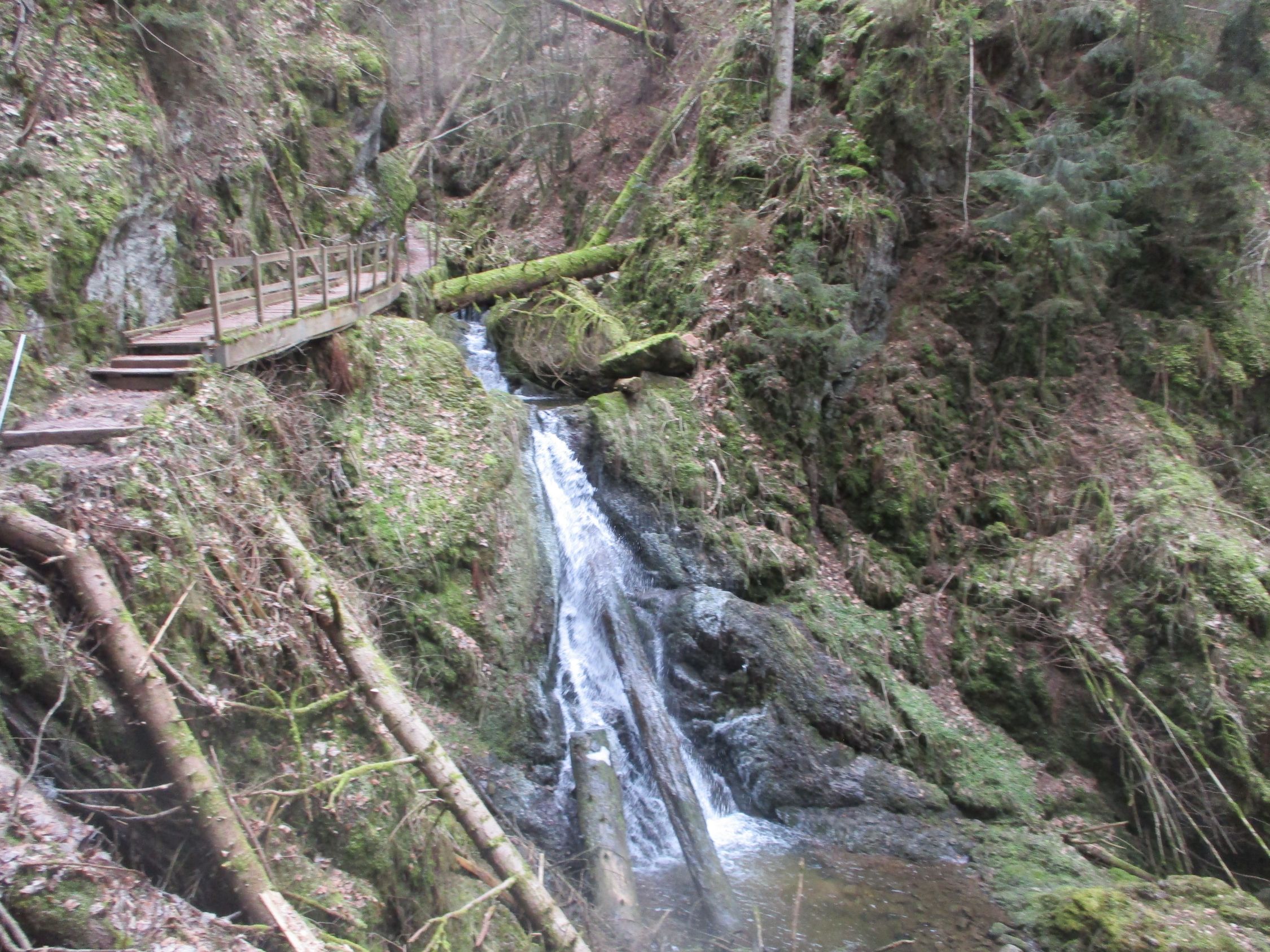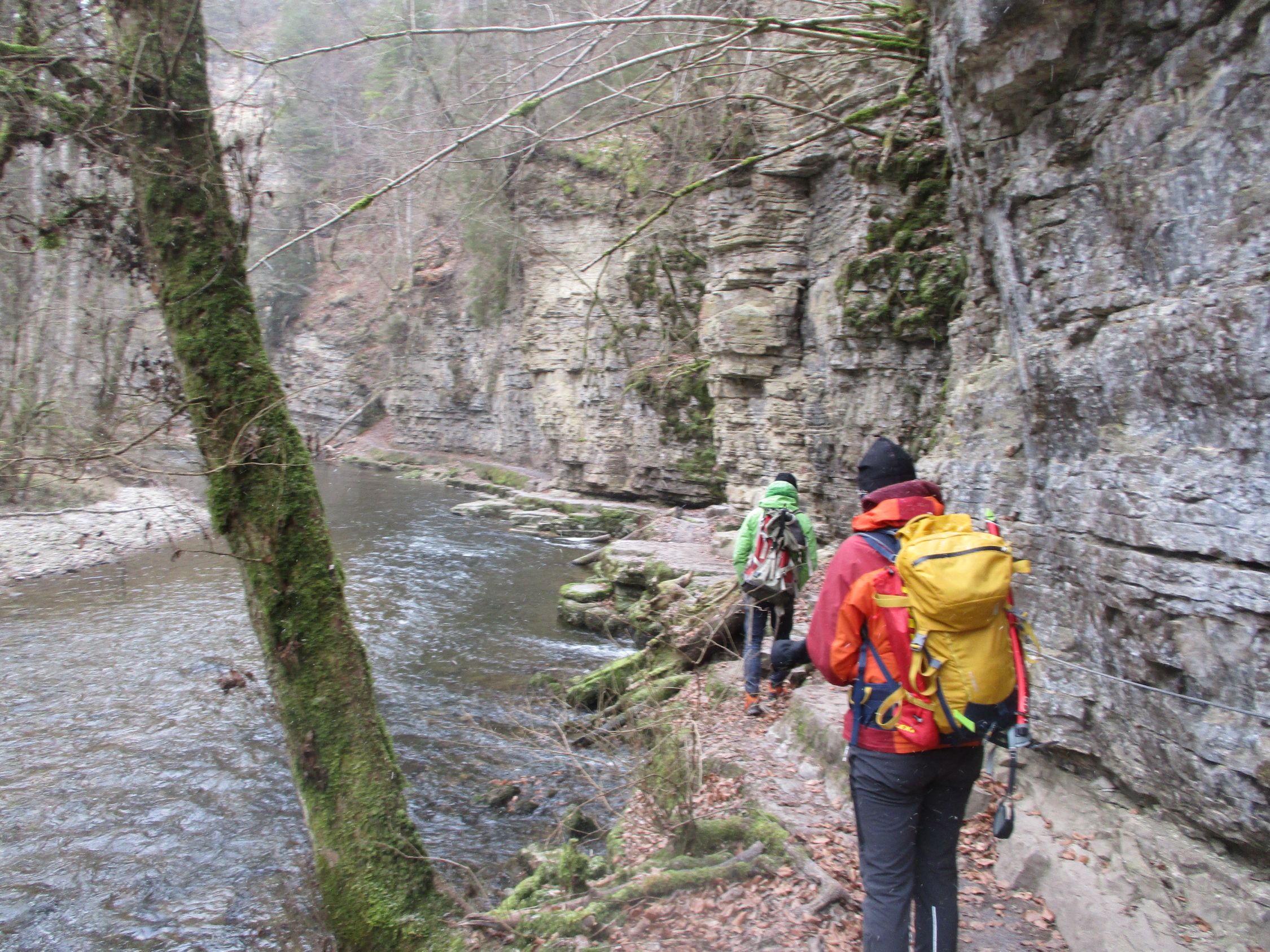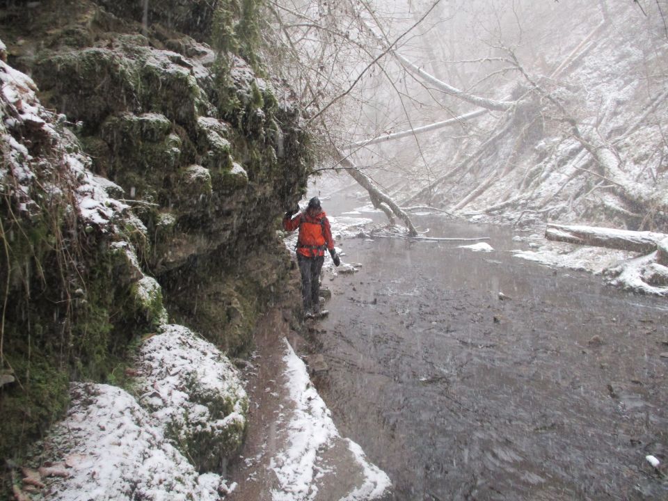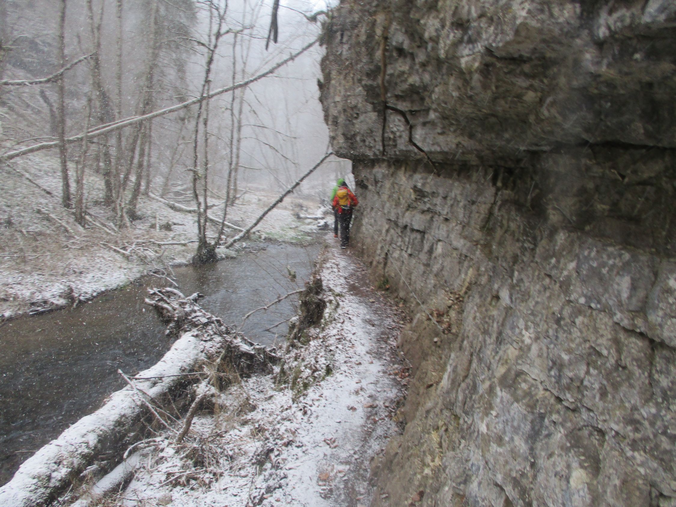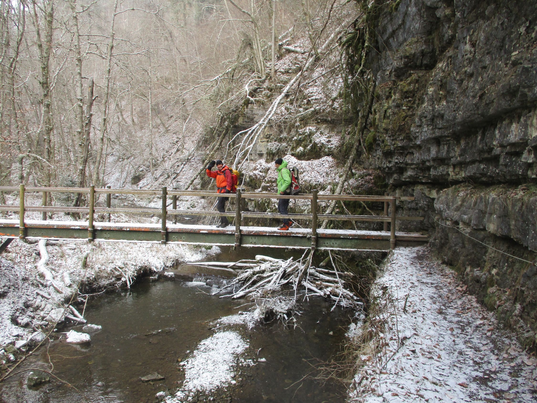 Nie würden wir im Winterhalbjahr ohne Pickel und Steigeisen ins Wutach-Schluchtensystem einsteigen. Werden diese Utensilien nicht benötigt, so wie heute, dann soll´s auch recht sein. Alle drei Schluchten waren wohl aufgrund der vorangegangenen längeren Wärmeperiode komplett eisfrei, die Wege überwiegend trocken. Dezent sonnige Abschnitte wechselten mit leichten Schneeschauern, die sich am Nachmittag verstärkten, weshalb der Schnee in der Gauchachschlucht dann auch liegen blieb. Bei Tourenbeginn morgens nach 10 um die minus 5, später gegen Null gehend. Dort, wo der Wind hinkam, merklicher Chilleffekt. Am heftigsten war es nach dem Ausstieg aus der Gauchachschlucht auf dem Hochplateau auf Döggingen zu.