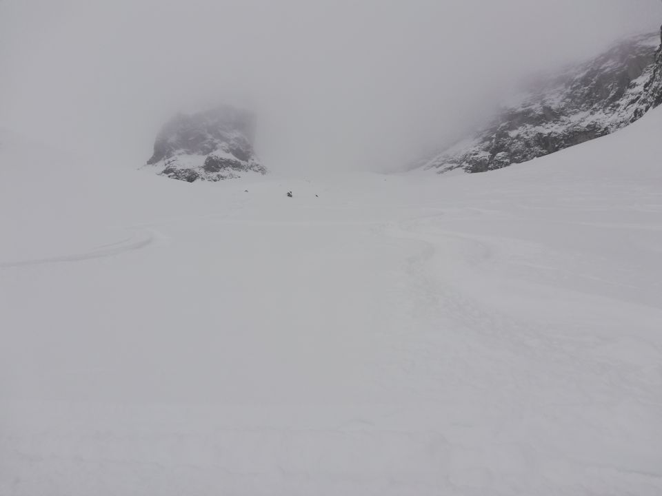 Wir wussten aber wie steil es dann dort wird und entschlossen uns zur Umkehr da es spätestens ab hier sehr schlecht einzuschätzen war wieviel Schnee von oben noch kommen könnte.