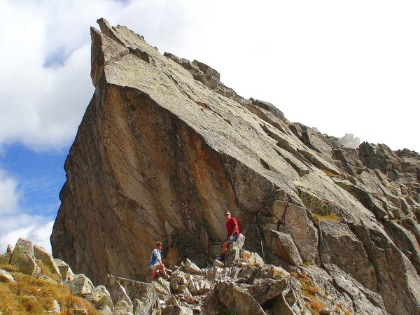 Die Cima Presanella ist der höchste Gipfel des gesamten Trentino. Weit über die Provinzgrenzen hinaus ist die Presanella bekannt und gilt als einer der bedeutendsten und eigenständigsten Berge der Südalpen. Vier Anstiege bieten sich dem Hochalpinisten an. Von Norden über das Rifugio Denza (Gletschertour). Von Süden aus dem Hinteren Val Genova über das Rifugio Mandrone und den Freshfieldsattel (ebenfalls Gletscher). Eisfrei aus dem Vorderen Val Genova über das Bivacco Roberti und schliesslich unsere Route, ebenfalls von Süden, aus dem Val Nambrone, über das Rifugio Giovanni Segantini und den Passo dei Quattro Cantoni. Nach Norden entsendet die Presanella einen imposanten, geradlinigen Felspfeiler. Die 60° steile Eistour links des Pfeilers ist klassisch geworden und glänzt auch heute noch oft mit guten Bedingungen. Als wir am Samstag Abend auf der Segantini-Hütte ankommen, freuen wir uns schon auf einen grossartigen, spannenden Anstieg auf diesen berühmten Südalpengipfel. Eine abenteuerliche Route hat bis vor kurzem noch über die Bocchetta di Monte Nero und das Bivacco Orobica auf den Gipfel geführt. Klettern im II. Grad, ausgesetzte Wandquerungen, eine überhängende Leiter, dessen Sprossen ausgehen noch ehe man am Gletscherboden angekommen ist und Eispassagen, die Pickel und Steigeisen unabdingbar machen. Diese Zutaten haben uns das Wasser im Mund zusammenlaufen lassen. Zusammengelaufen ist es dann höchstens wegen der köstlichen Minestrone und den ausgezeichneten Spaghetti auf der Segantini-Hütte. Vom Hüttenwirt mussten wir erfahren, dass die Route über die Bocchetta di Monte Nero, jedenfalls derzeit, nicht mehr begehbar ist. Der Gletscherschwund hat grässliche Felsabbrüche freigelegt, die stark von Steinschlag bedroht sind, wo das Durchkommen fast unmöglich bzw. lebensgefährlich wäre. Die Ersatzroute führt nun über den Passo dei Quattro Cantoni zur Südseite der Cima Presanella. Wir steigen ca. 50 m vom Pass ab und halten Ausschau nach roten Punkten. Diese Markierungen wurden neu angebracht und führen horizontal über Felsblöcke zur rechten Seitenmoräne des Vedretta di Nardis. Nun geht es ein Stück die Moräne hinauf und dann in zunehmend wüstem Geröll über die Südabdachung zum höchsten Punkt. Steinmännchen erleichtern die Orientierung. Unter dem Gipfel bringt noch ein Firnfeld etwas Abwechslung, in den sonst eher eintönigen Schutthatscher. Schade, dass es im Moment keine bessere Alternative, zum bisher spannenden Gipfelaufstieg gibt.