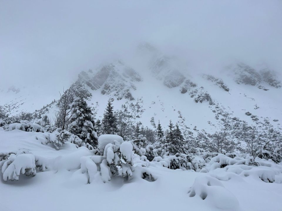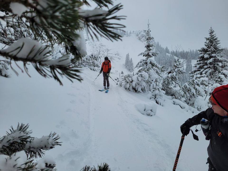 Weg durch Latschen nach dem Wald nicht einfach, (zu wenig Schnee). Aufsteilung nach den Latschen kritisch zu beurteilen imnSchneefall und Nebel. War uns zu heikel daher Abbruch