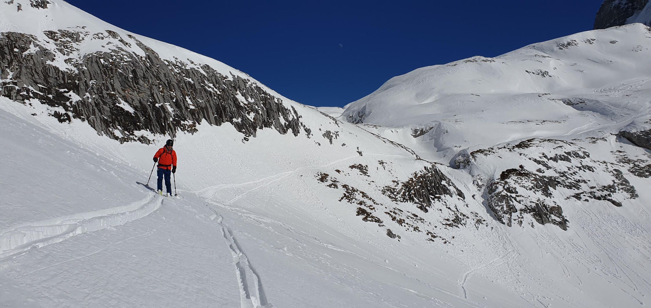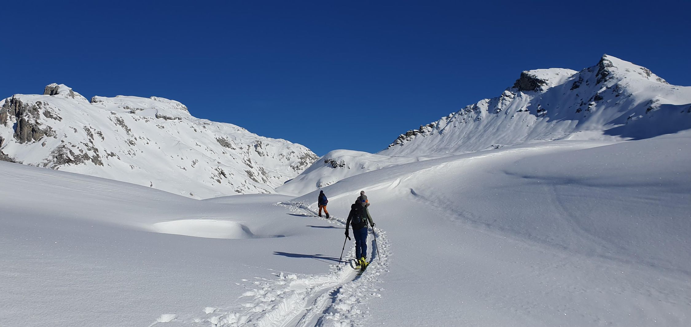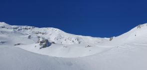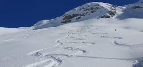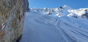 In St. Antönien gab es praktisch keinen Neuschnee. Erst über die Plasseggen und später auf der Abfahrt im oberen Bereich Richtung Gruobenpass gab es etwa 10 bis 30 cm Neuschnee. Um die Mittagszeit war der Schnee beim Partnunsee bereits aufgeweicht.