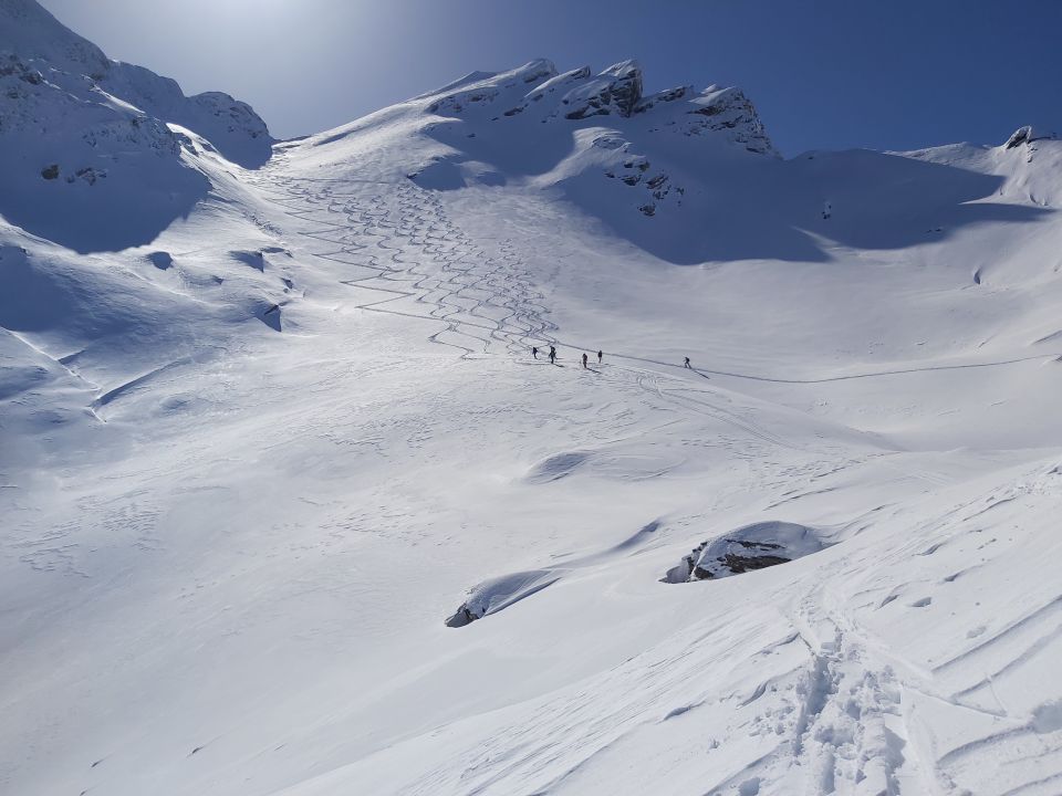 Heute der perfekte Tag für die Tour zum Alvier mit viel Sonne zum Geniessen. Auf Strasse bis 1500m (Malschüeluntersäss) reicht Schnee gerade noch, weiter oben meist noch schöner Pulver, teilweise etwas Wind-Harst gut fahrbar, Gipfelaufstieg unproblematisch
