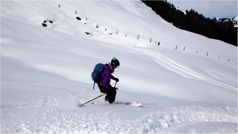 Die Bedingungen sind nich mehr so optimal wie vor zwei Tagen. Die Sonne hat bereis ganze Arbeit geleistet, Pulverschnee ist nur noch in schattigen Hängen zu finden. Sonnseitig mehr oder weniger durchfeuchteter Schnee aber derzeit noch nicht tragfähig. Außerdem kommt die Wiese wieder zum Vorschein, man merkt einfach die geringe Gesamtschneemenge.