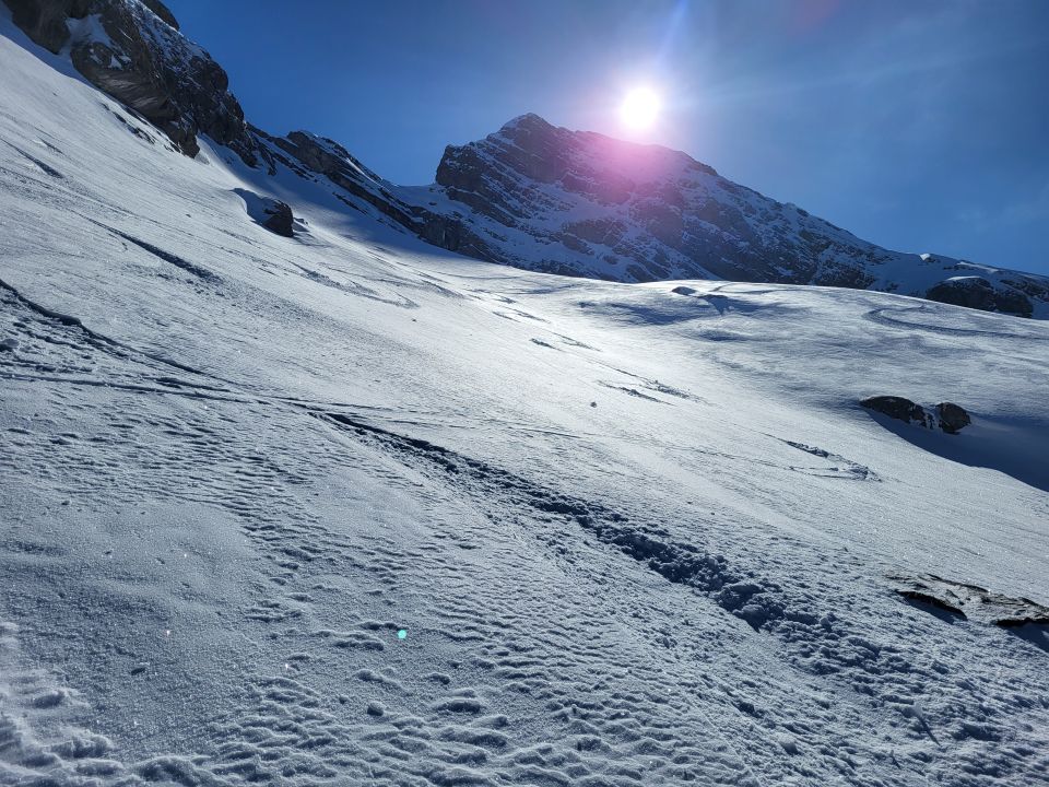 Einige ältere Spuren vorhanden der Vortage, z.T. zugeweht und insgesamt kaum störend. Vorhandene Aufstiegsspuren sehr unregelmässig, jetzt etwas besser.