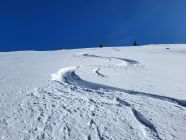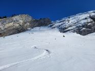 Einige ältere Spuren vorhanden der Vortage, z.T. zugeweht und insgesamt kaum störend. Vorhandene Aufstiegsspuren sehr unregelmässig, jetzt etwas besser.