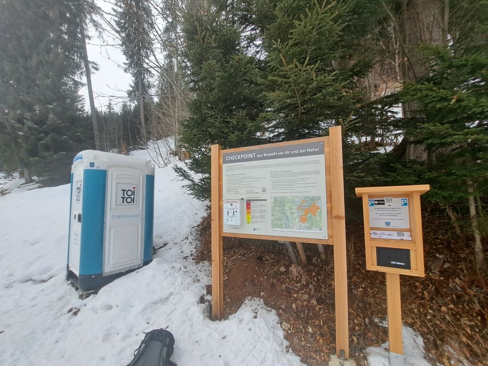 Es kann ab Parkplatz (freiwillige Gebühr, mit WC und LVS Tester, Super eingerichtet!) mit den Fellen aufgestiegen werden. Durch den Wald einige wenige Stellen ausgeapert. In der Abfahrt teilweise Skier tragen und teilweise kann umfahren werden.