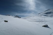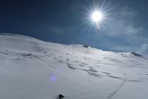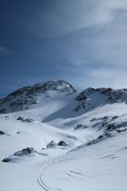 Bis unter den Gipfel super Aufstiegsspur, danach gings zu Fuss weiter. Im Moment kann man den Gipfel problemlos ohne Steigeisen besteigen, es hat gute Stapfspuren. Bei der Abfahrt hatten wir in der oberen hälfte schöner Pulver auf tragender Unterlage, im untern Bereich Pisten ähnlich.