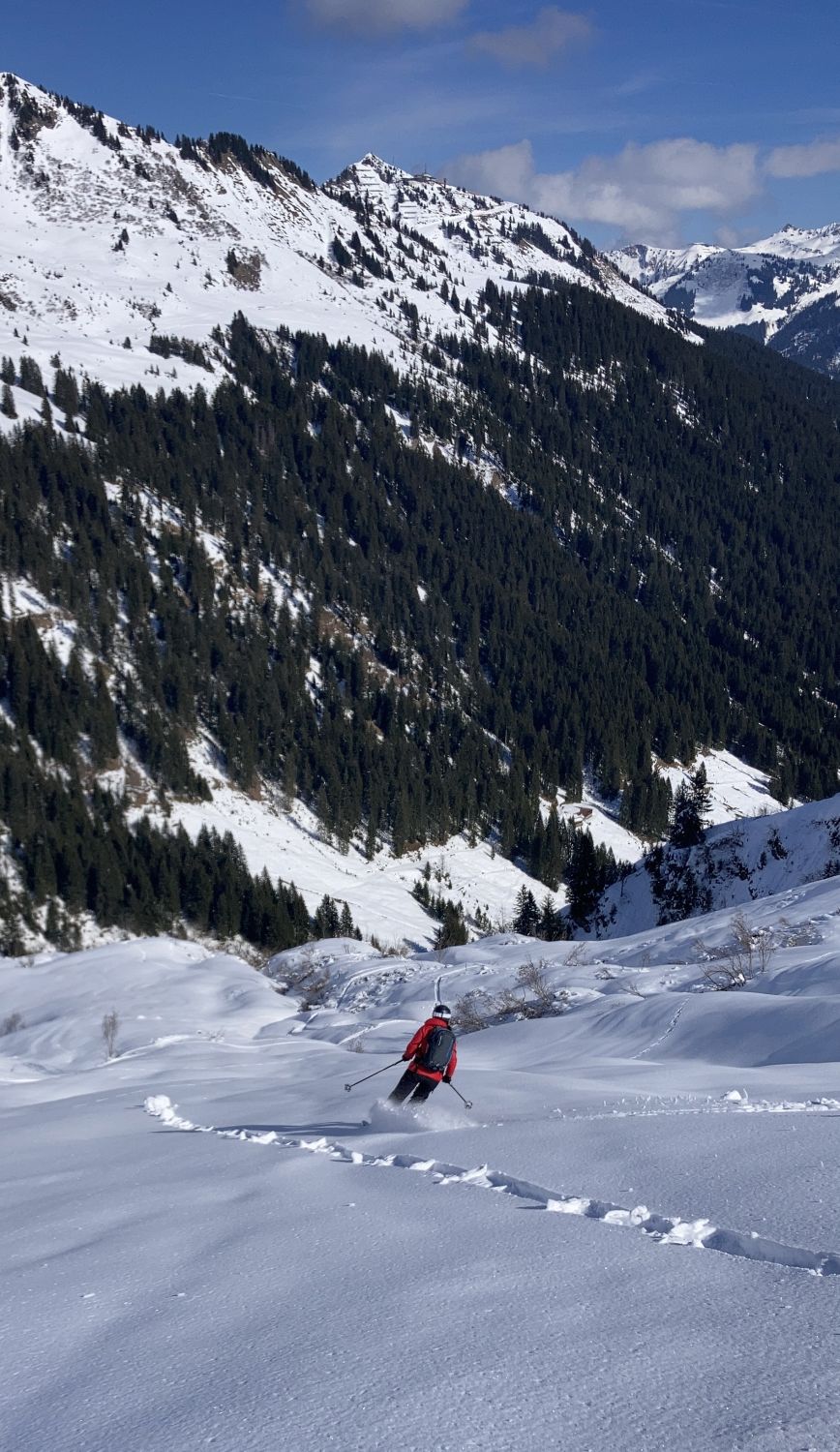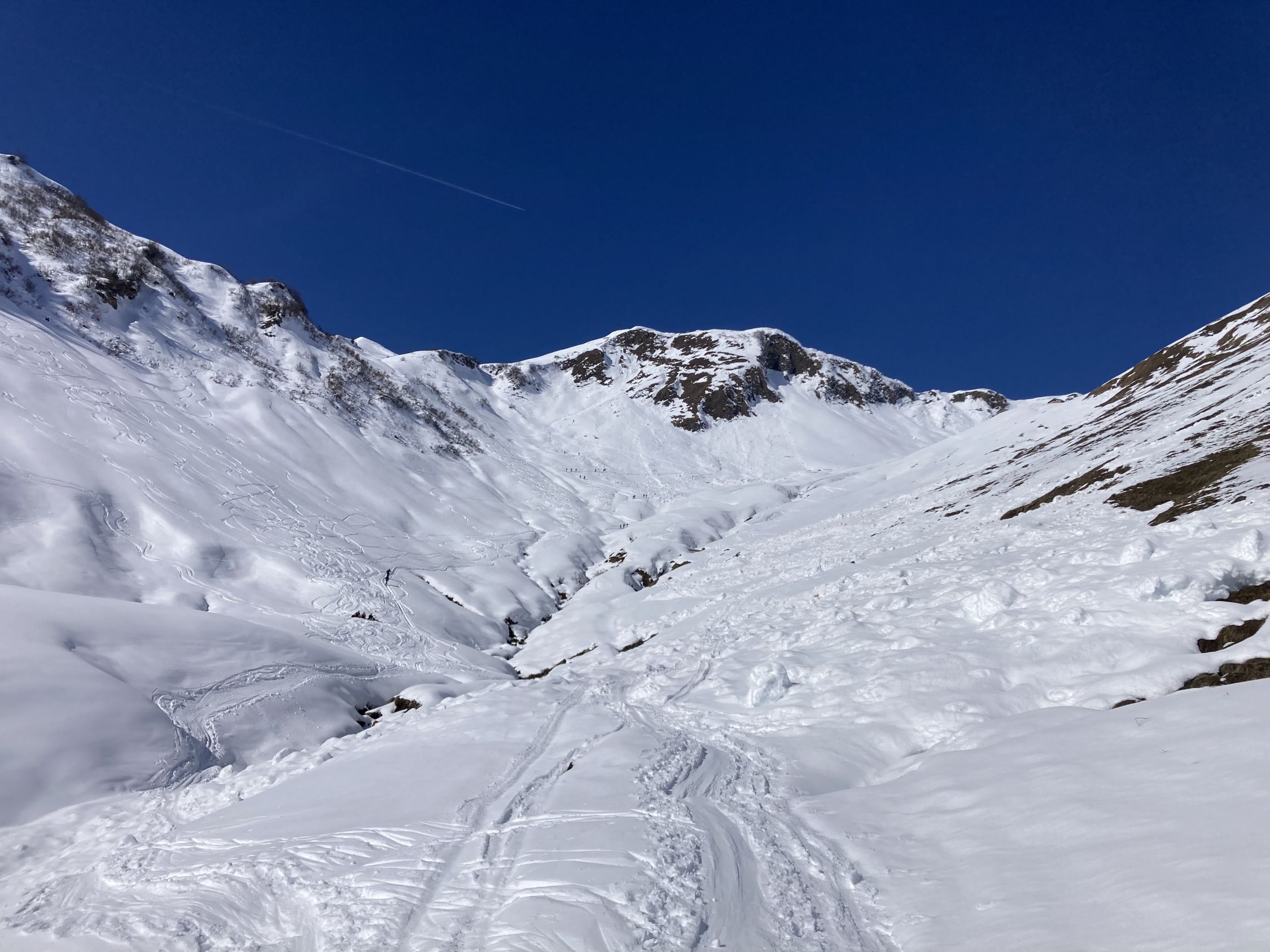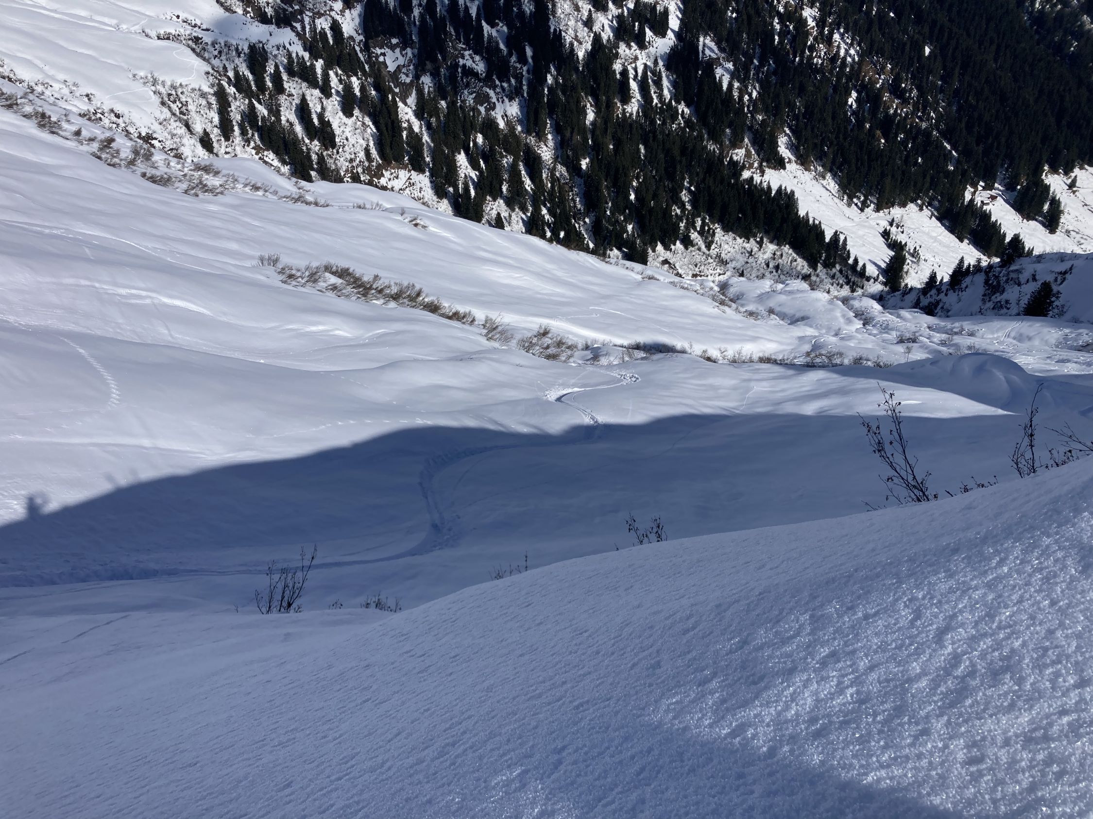 Aufstieg problemlos, unten hart und tragend. Im Steilhang zur unteren Spitalalpe hoch wurde es heute dann schon recht schnell weich und die Sonne zeigte ihre Kraft. Es waren viele Tourengeher unterwegs, die aber fast alle erwartungsgemäß zur Güntlespitze abbogen. Zum Derrenjoch haben wir nur 4 Leute getroffen. Derrarinne selbst komplett verspurt. Wir sind etwas weiter links eingestiegen, da finden sich noch unverspurte Bereiche. Man findet zur Zeit fast alles: nord: kompakter und gut gesetzter Pulver. Sobald man in die besonnten Bereiche kommt leichte Lamelle spürbar. Westseitig Windpress, süd firn. Weiter unten dann hart und harschig. Untere Hälfte der Rinne zerfahren und harter Bruchharsch. Entlang des Baches dann erwartungsgemäß wenig Schnee und man muss zum Bachseite wechseln mehrmals balancieren. Ist aber problemlos möglich. Insgesamt aber trotzdem noch lohnend.