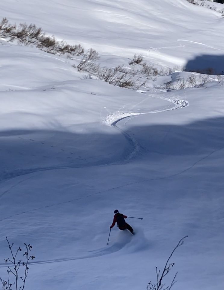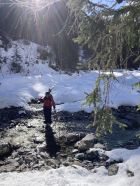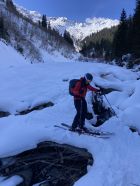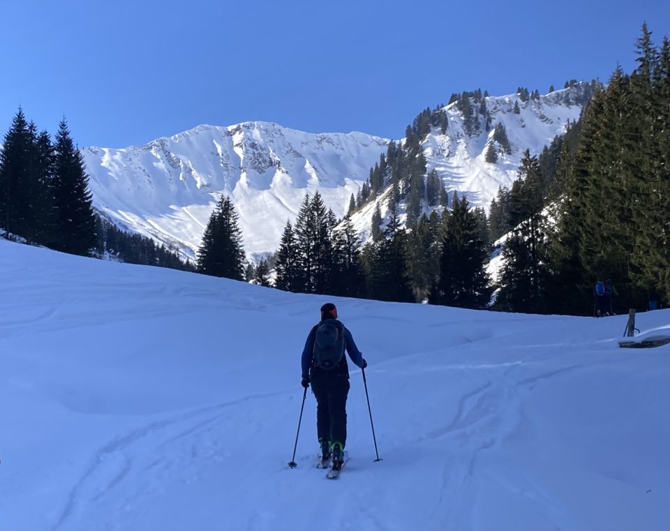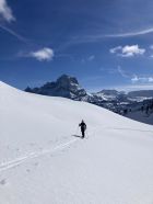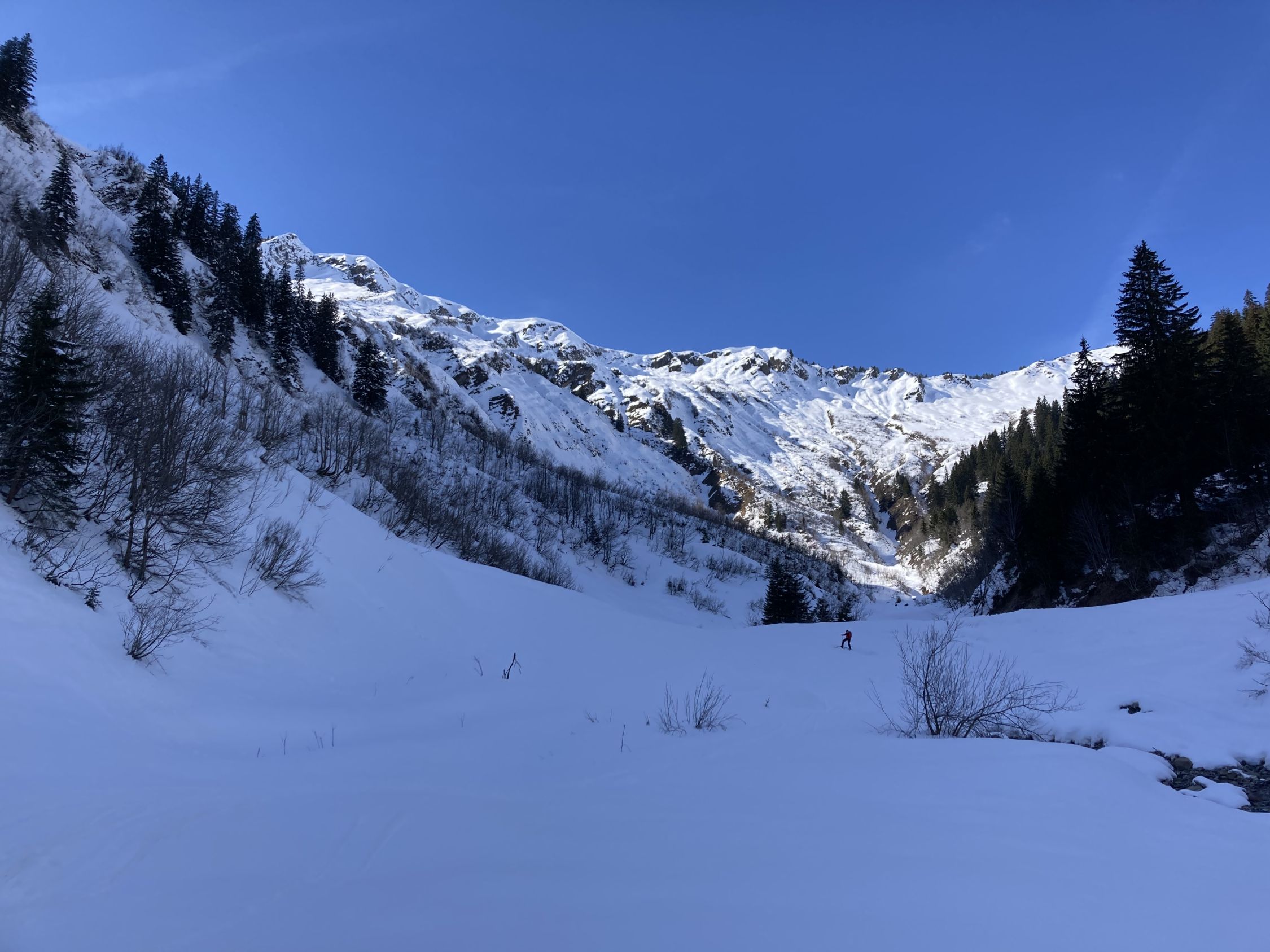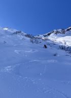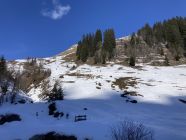 Aufstieg problemlos, unten hart und tragend. Im Steilhang zur unteren Spitalalpe hoch wurde es heute dann schon recht schnell weich und die Sonne zeigte ihre Kraft. Es waren viele Tourengeher unterwegs, die aber fast alle erwartungsgemäß zur Güntlespitze abbogen. Zum Derrenjoch haben wir nur 4 Leute getroffen. Derrarinne selbst komplett verspurt. Wir sind etwas weiter links eingestiegen, da finden sich noch unverspurte Bereiche. Man findet zur Zeit fast alles: nord: kompakter und gut gesetzter Pulver. Sobald man in die besonnten Bereiche kommt leichte Lamelle spürbar. Westseitig Windpress, süd firn. Weiter unten dann hart und harschig. Untere Hälfte der Rinne zerfahren und harter Bruchharsch. Entlang des Baches dann erwartungsgemäß wenig Schnee und man muss zum Bachseite wechseln mehrmals balancieren. Ist aber problemlos möglich. Insgesamt aber trotzdem noch lohnend.