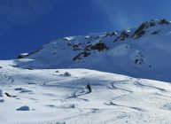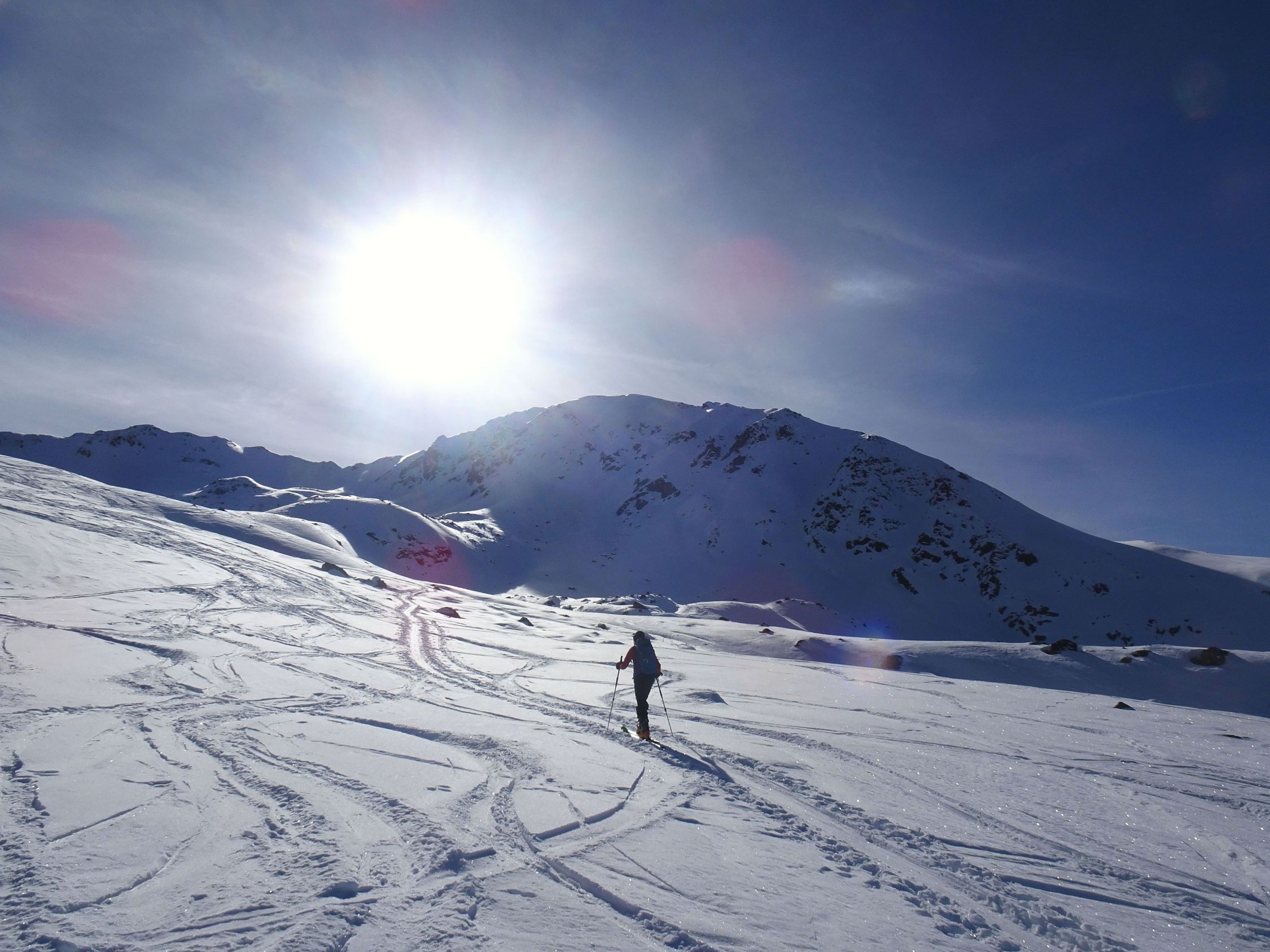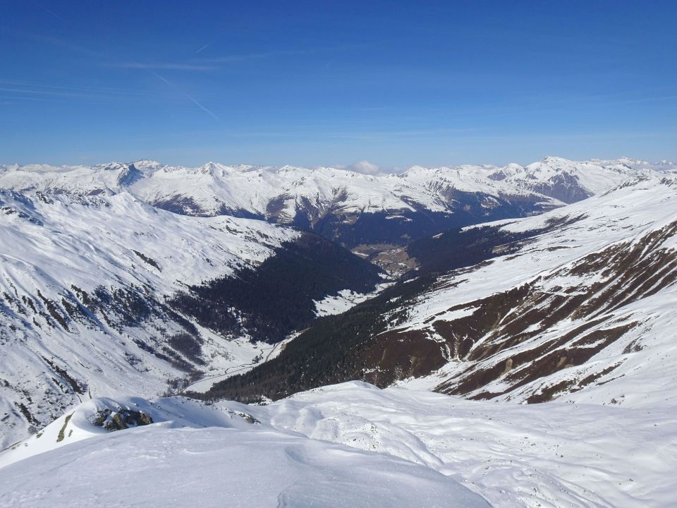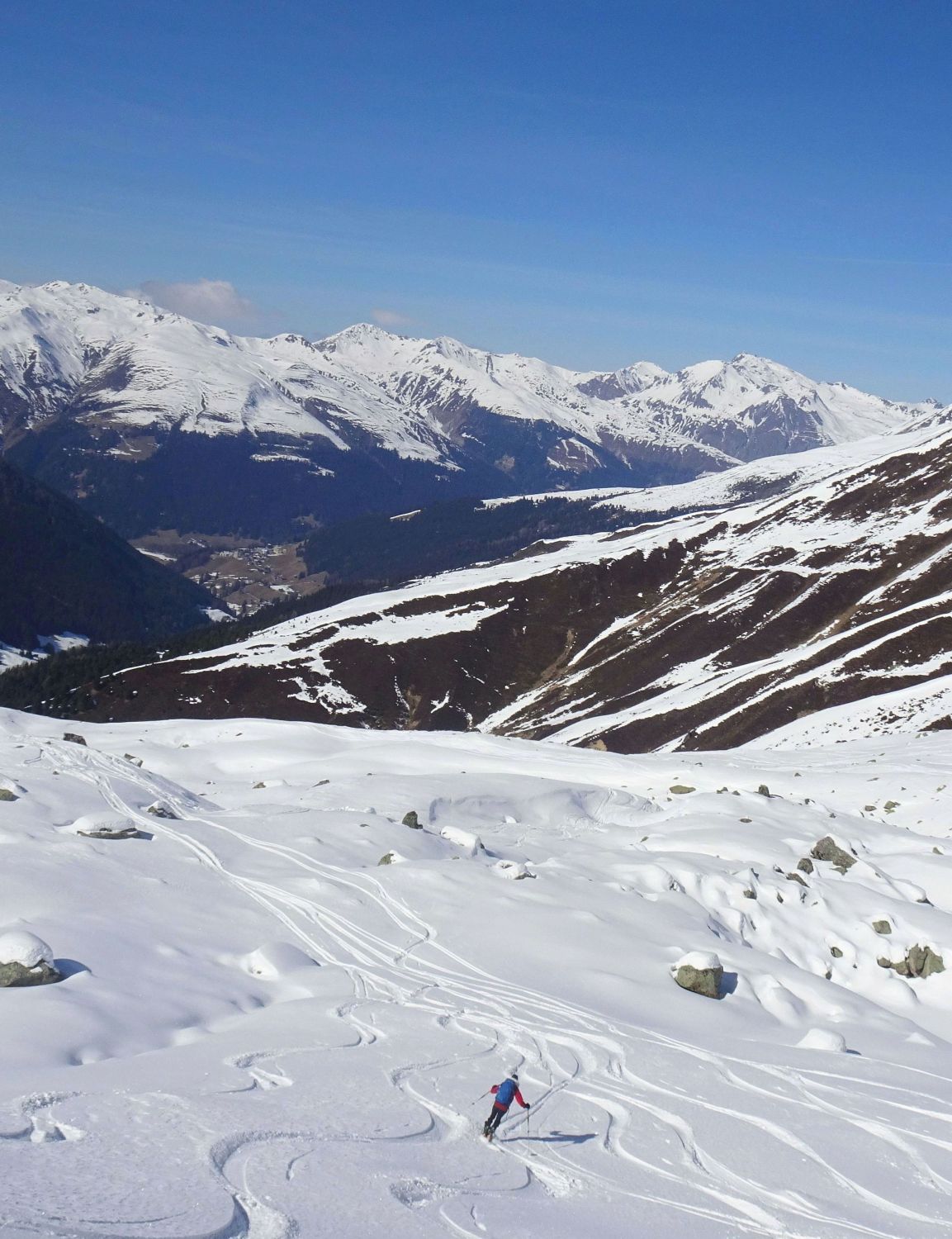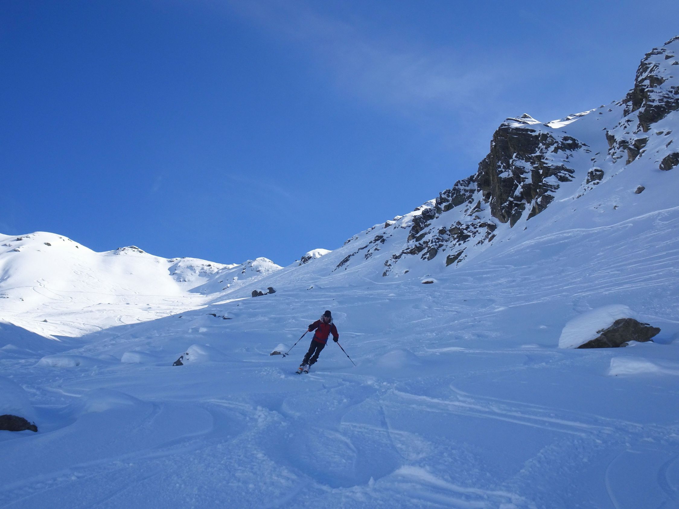 Abfahrt besser als im Aufstieg erwartet. Obwohl es hier letztes Wochenende nicht allzu viel Neuschnee gab und oben teils verblasen ist, liessen sich in Schattenhängen und Mulden durchaus schöne Pulverpassagen finden. Vorsicht auf Steine ist allerdings angebracht. Unten raus dann etwas ruppig.