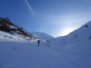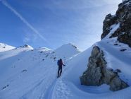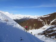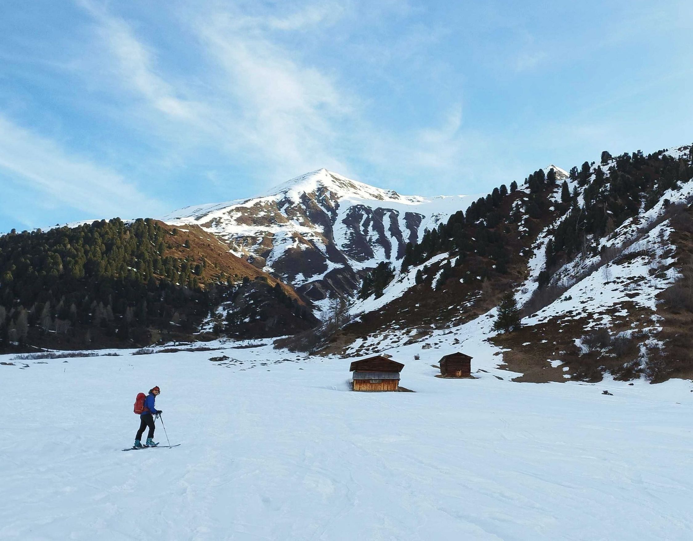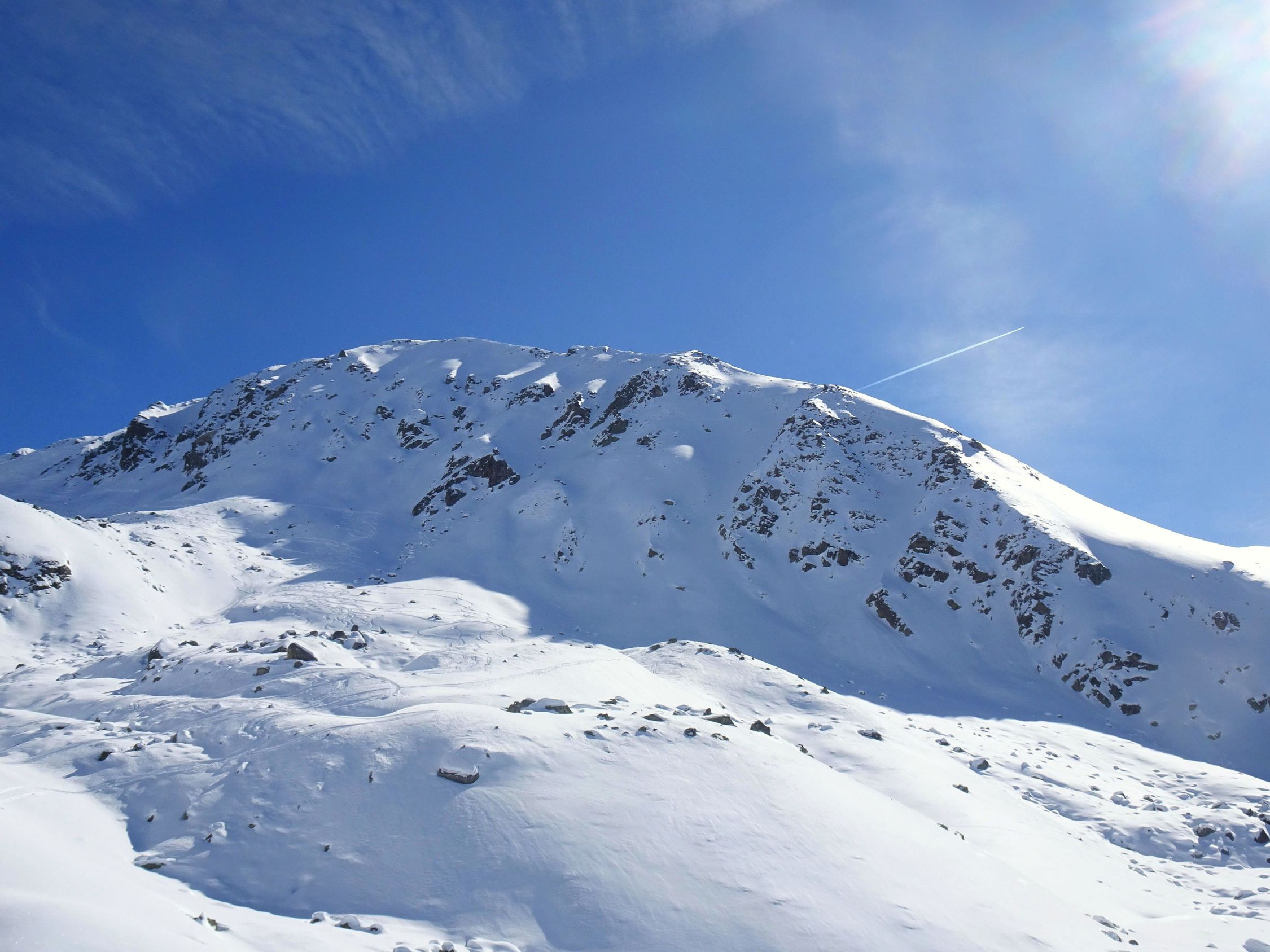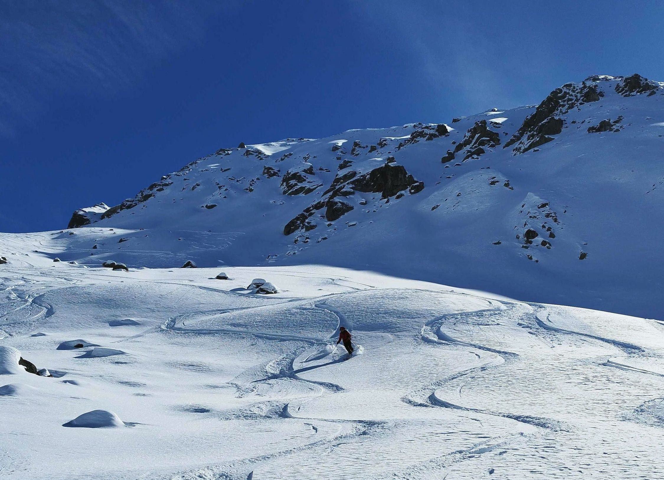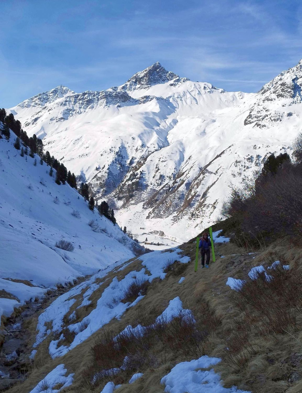 Abfahrt besser als im Aufstieg erwartet. Obwohl es hier letztes Wochenende nicht allzu viel Neuschnee gab und oben teils verblasen ist, liessen sich in Schattenhängen und Mulden durchaus schöne Pulverpassagen finden. Vorsicht auf Steine ist allerdings angebracht. Unten raus dann etwas ruppig.