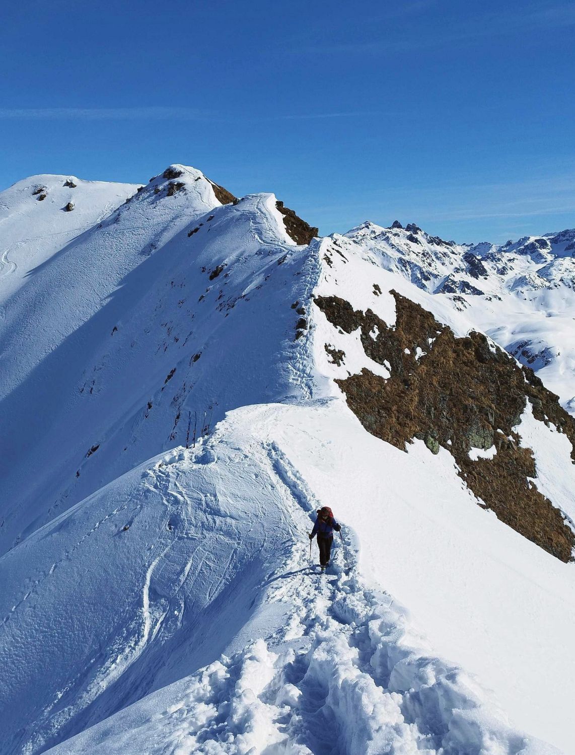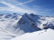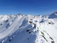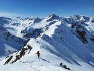 Aufstieg ab Sertig in guter Spur mit kurzer Unterbrechung im Bachtälchen. Schnee griffig, ging bis zum Ausstieg am Grat ohne Harscheisen. Fußaufstieg zum Gipfel mit Trittschnee, gut zu gehen. Wir haben dann noch einen kurzen Abstecher zum Ostgipfel gemacht.